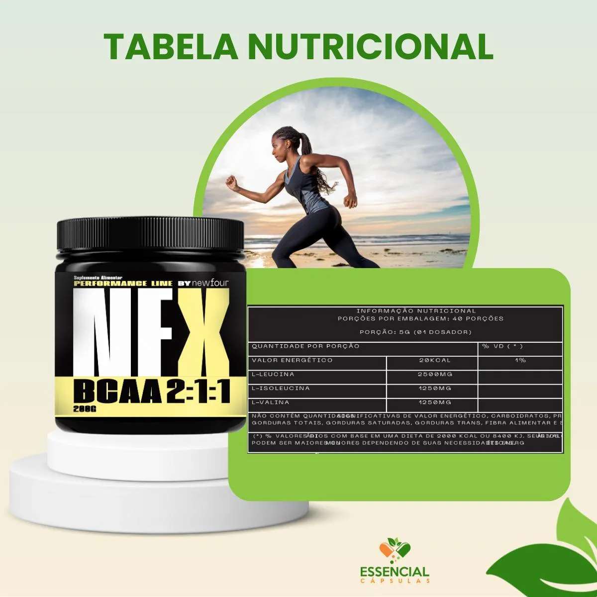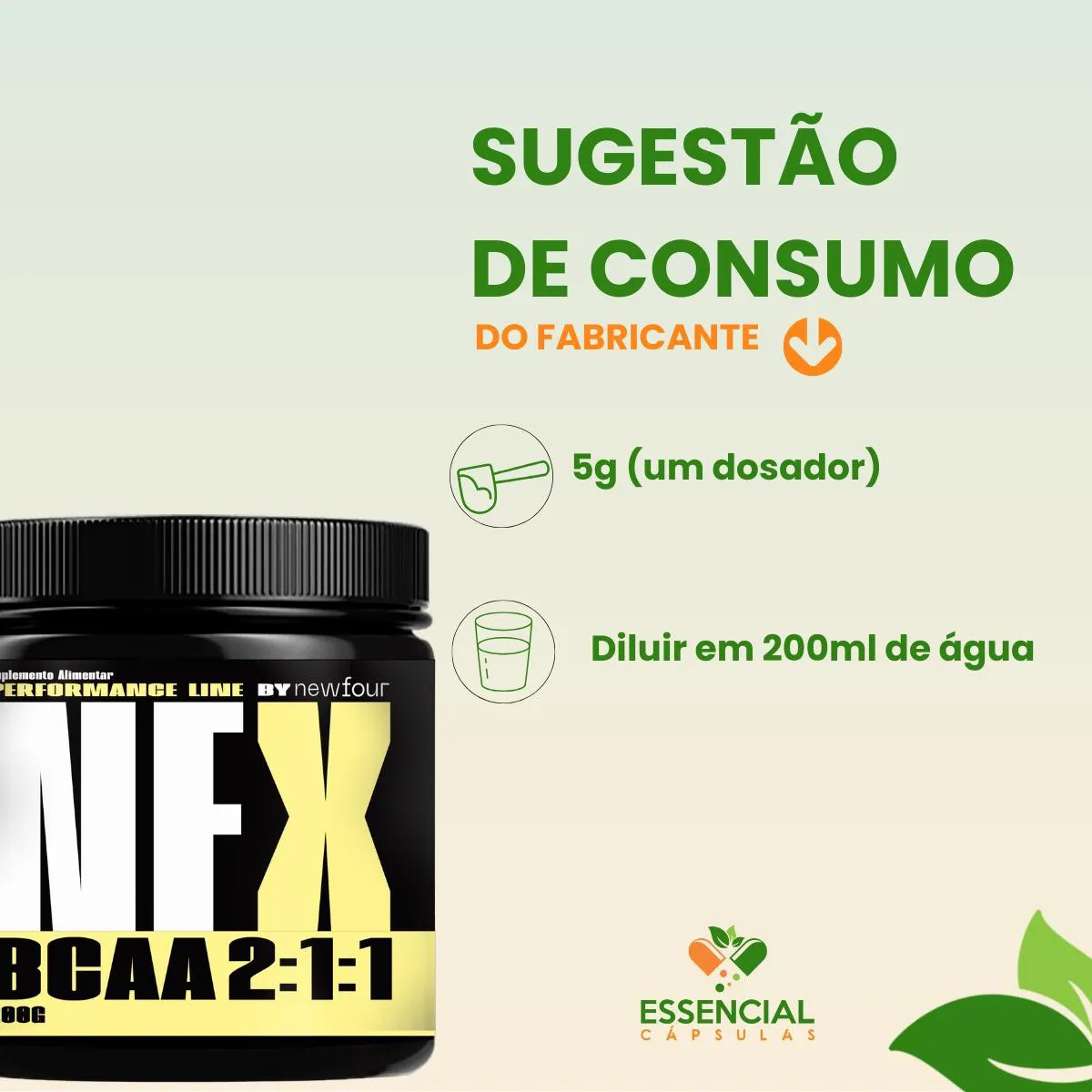 BEM VINDO(A) À ESSENCIAL CÁPSULAS Aqui, acreditamos que cuidar da saúde pode (e deve) ser algo natural, leve e diário. PRODUTO: - bcaa MARCA: - NEW FOUR BENEFÍCIOS: ● Combinação muito utilizada em rotinas de treino ● Pode ser incluído antes ou após atividades físicas ● Ideal para quem mantém uma rotina ativa e intensa SUGESTÃO DE CONSUMO (PELO FABRICANTE): - 5g (1 dosador) - Diluir em 200ml de água IMPORTANTE SABER: - Este produto é um suplemento alimentar natural. - Não é medicamento e não substitui uma alimentação equilibrada nem o acompanhamento de um profissional da saúde. - Como um produto natural, seus benefícios podem ser vistos a partir de alguns dias do uso. - Os suplementos são destinados a pessoas saudáveis. Sua finalidade é fornecer nutrientes, substâncias bioativas, enzimas ou probióticos em complemento à alimentação. COMPOSIÇÃO: - L-Leucina, L-Isoleucina, L-Valina NÃO CONTÉM GLÚTEN CONTRAINDICAÇÃO: - O uso não é recomendado para gestantes, lactantes e crianças. - Em caso de uso contínuo de medicamentos ou condições específicas de saúde, busque a orientação de um profissional da saúde. QUALIDADE: - Sabemos que o mercado de suplementos é competitivo, com opções para todos os públicos e faixas de preço. Na nossa loja, priorizamos a qualidade em cada detalhe. Por isso, escolhemos trabalhar apenas com fábricas que utilizam matérias-primas de excelência e seguem rigorosos padrões de produção. ENVIAMOS RAPIDINHO: - Seu pedido é preparado com todo cuidado e postado em até 24 horas úteis após a confirmação da compra. (Na maioria das vezes, enviamos bem antes disso)! FALE CONOSCO: Tem dúvidas ou quer conversar sobre o produto? Nosso atendimento é humanizado e está sempre pronto para te ouvir com muita atenção!