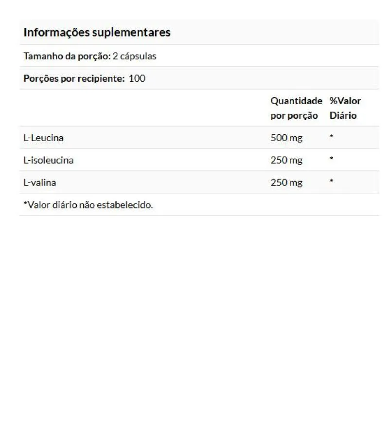L-Leucina, L-Isoleucina e L-Valina são comumente agrupadas e chamadas de Aminoácidos de Cadeia Ramificada, ou BCAAs, devido à sua estrutura química ramificada única. Os BCAAs são essenciais e devem ser consumidos por meio da dieta, já que o corpo humano não pode produzi-los a partir de outros compostos. Uma dose de 2 cápsulas fornece 1.000 mg de BCAAs.