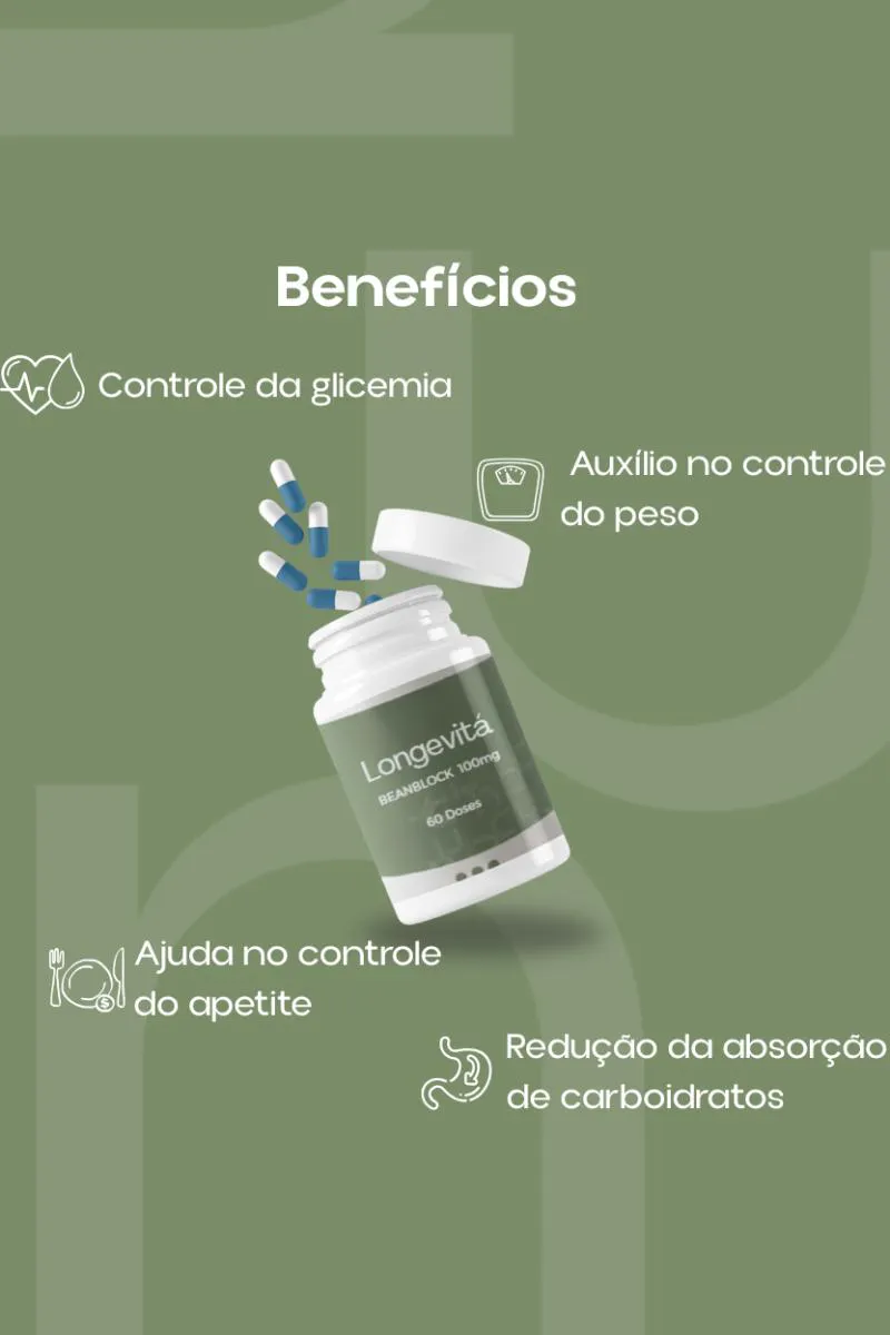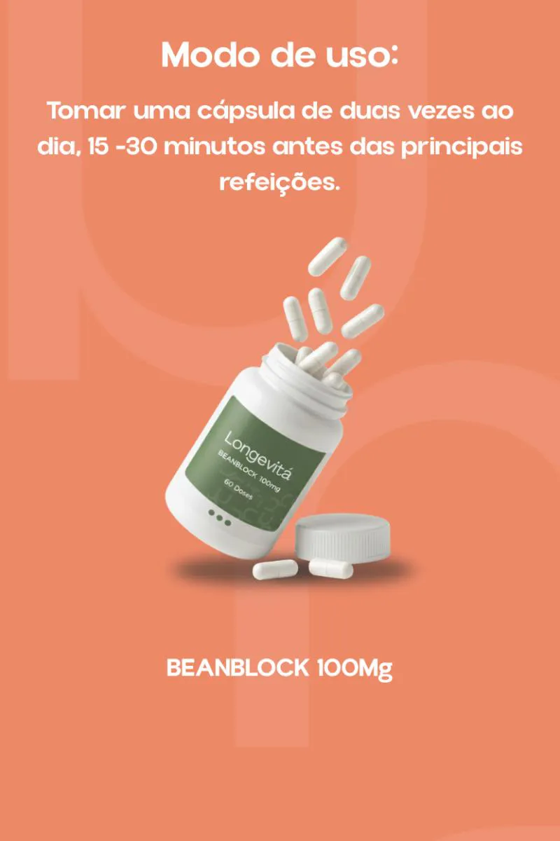 O Beanblock 100mg – Longevitá é um suplemento alimentar desenvolvido para auxiliar pessoas que buscam mais equilíbrio na alimentação , especialmente em dietas com maior consumo de carboidratos.Sua composição atua como apoio nutricional , ajudando no controle alimentar e na manutenção de uma rotina mais equilibrada, quando associada a hábitos saudáveis.Principais benefícios: