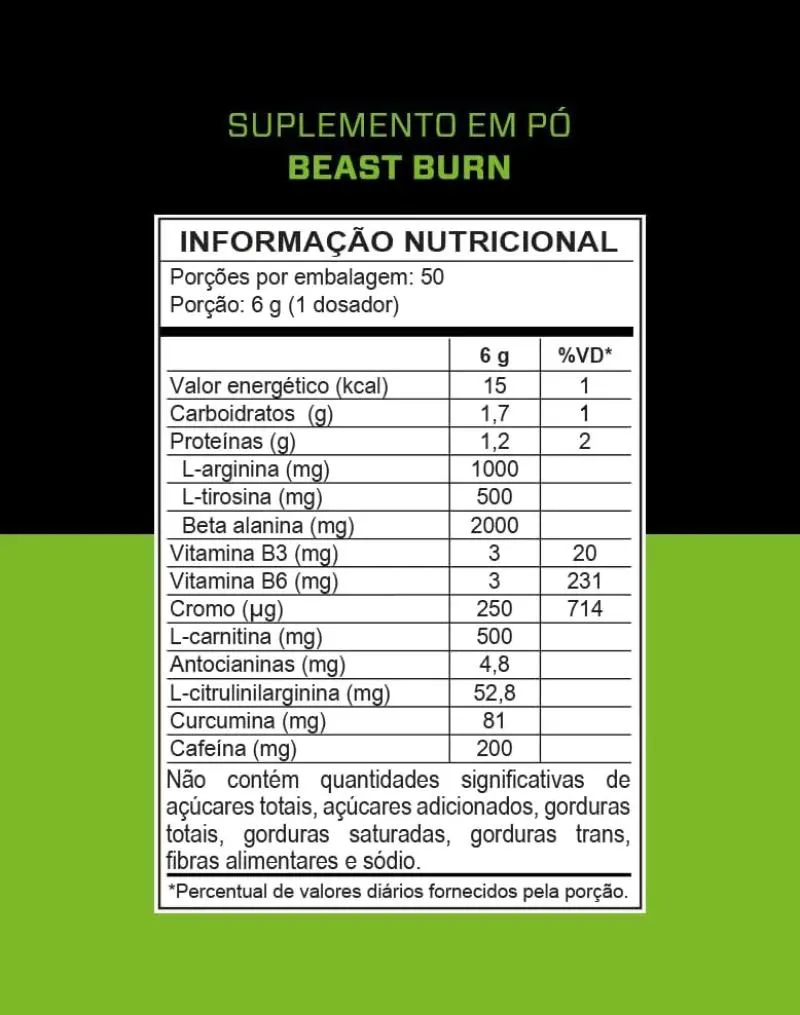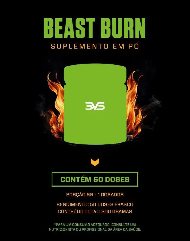 Pré-treino Beast BURN 300 g — o único no mercado com blend termogênico e energizante, que combina ingredientes potentes como Morosil®, beta-alanina, cafeína, arginina, cúrcuma, L-carnitina, picolinato de cromo e tirosina. Desenvolvido para elevar sua performance, acelerar o metabolismo e manter o foco mesmo durante treinos intensos e sob déficit calórico. - Queima de gordura e aumento do metabolismoA combinação de Morosil® (antioxidante exclusivo), L-carnitina e picolinato de cromo estimula o metabolismo lipídico, favorecendo a queima de gordura e o controle glicêmico. - Estado de alerta e energia prolongadaA cafeína oferece foco mental e disposição imediata, enquanto a beta-alanina contribui para adiar a fadiga muscular, estendendo a performance no treino.* Melhora do pump muscular e recuperaçãoIngredientes como arginina favorecem a vasodilatação, melhorando a circulação sanguínea, entrega de nutrientes e a recuperação muscular entre séries. - Ação anti-inflamatória naturalA presença de cúrcuma, rica em curcumina, auxilia no combate ao estresse oxidativo após treinos intensos. - Foco mental consistenteA tirosina potencializa a produção de neurotransmissores como dopamina e noradrenalina, sustentando foco e motivação do início ao fim dos treinos. - Fórmula completa e exclusiva no mercadoCom um blend sinérgico raramente encontrado em pré-treinos convencionais — unindo termogênico, energizante, antioxidante e focador mental em um só produto.