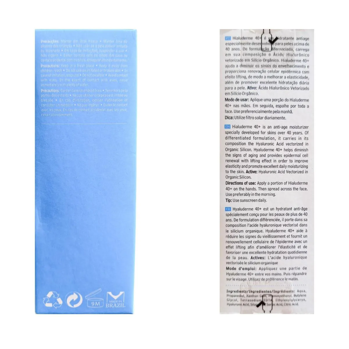 CARACTERÍSTICAS Hialuderme 40+ é um potente hidratante antiage especialmente desenvolvido para peles acima de 40 anos. Com sua formulação diferenciada, carrega em sua composição o Ácido Hialurônico fragmentado (de baixo peso molecular) e biovetorizado em silanol, um vetor biológico que serve como carreador para a absorção do AH, aumentando sua biodisponibilidade na pele. PRINCIPAIS ATIVOS Ácido Hialurônico Biotecnológico, Vetorizado em Silício Orgânico MODO DE USO Aplique uma porção do Hialuderme 40+ nas mãos. Em seguida, espalhe por toda a face. Use preferencialmente pela manhã.