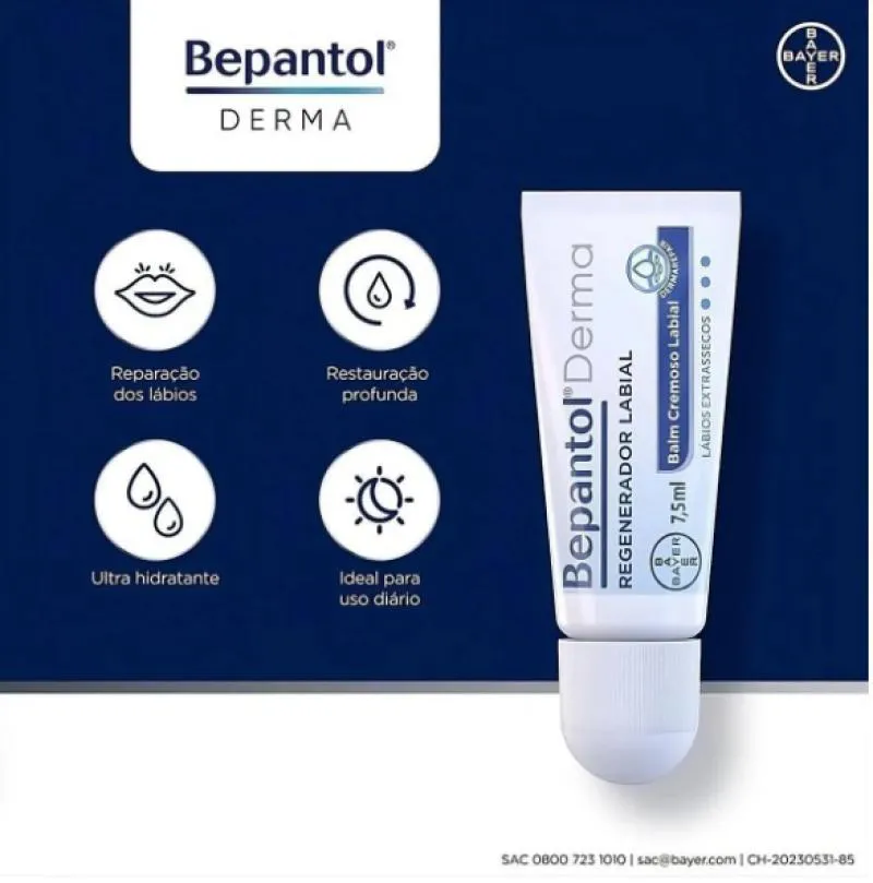 O Bepantol Derma Regenerador Labial é um produto de hidratação labial formulado com vitamina e e dexpantenol (pró-vitamina B5), desenvolvido especificamente para o cuidado da pele delicada dos lábios. Serve para hidratar intensamente os lábios, estimular a renovação celular natural da pele, reparar e proteger a região labial, mantendo-os macios, nutridos e com aparência saudável.