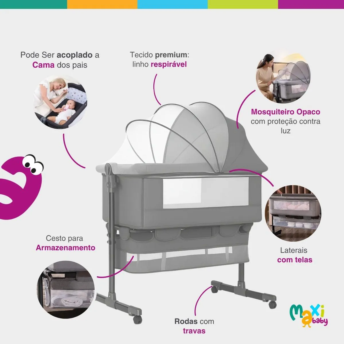 - Inclui mosquiteiro, colchonete e cesto inferior organizador