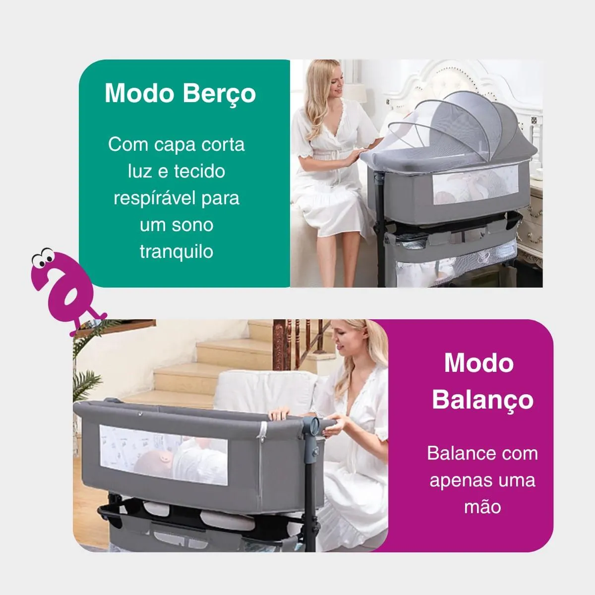 - Função berço com balanço para embalar o bebê.