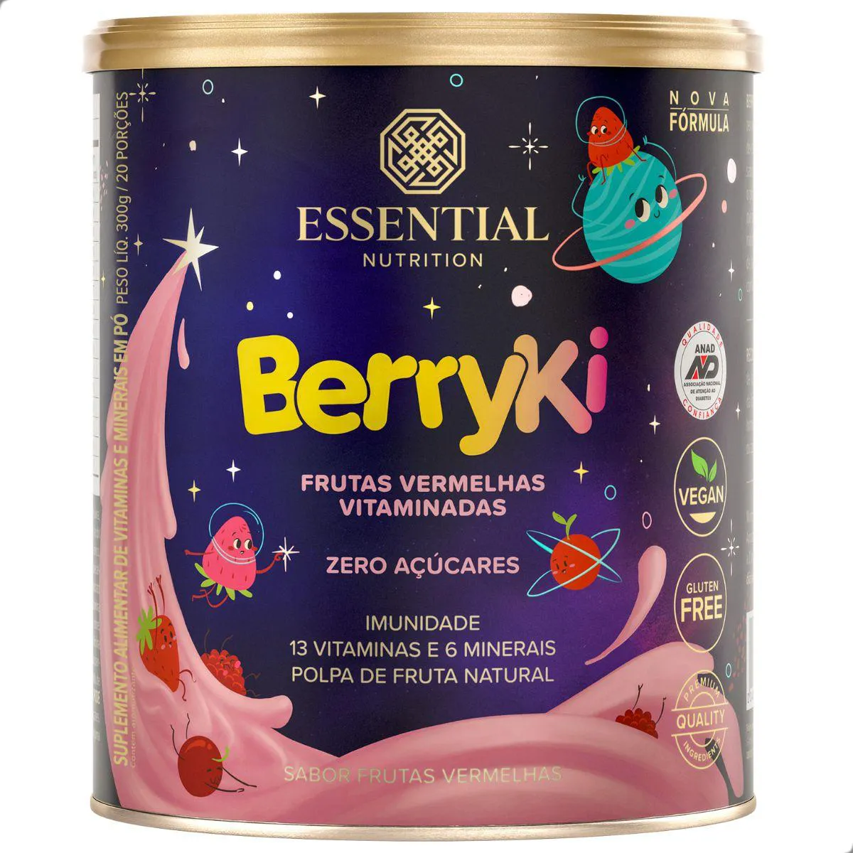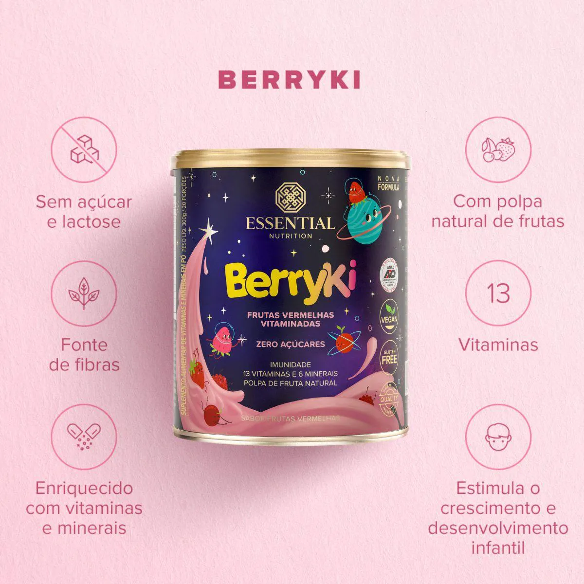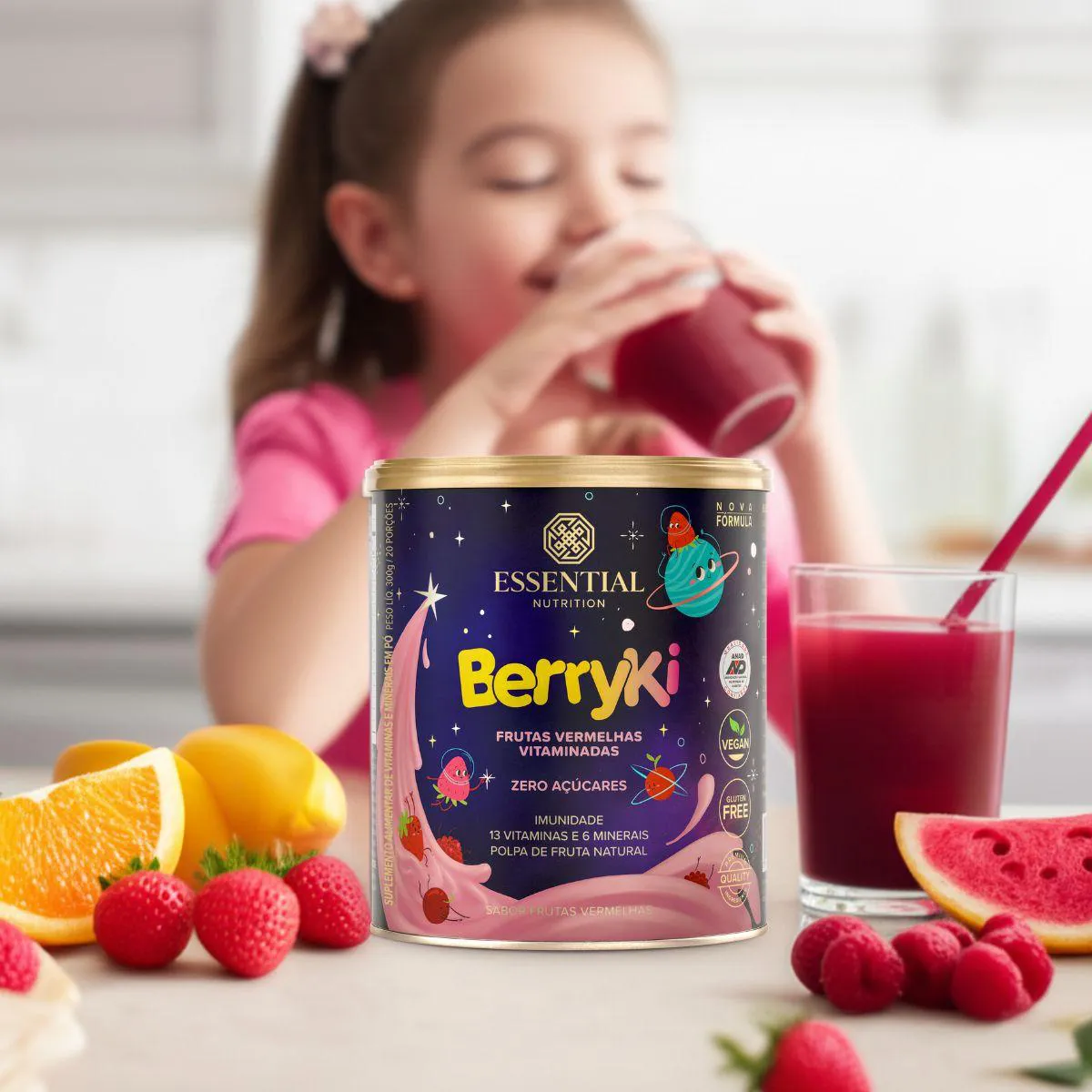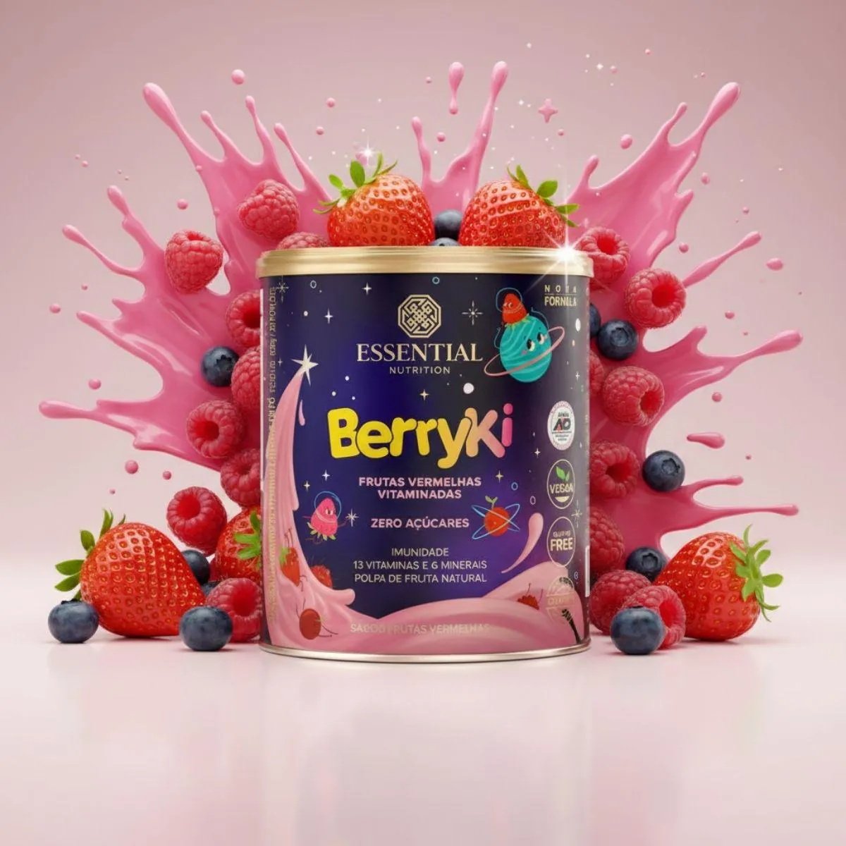 BerryKi Multivitamínico da Essential Nutrition é um suplemento em pó de 300 g com sabor frutas vermelhas, formulado para crianças. Combina vitaminas e minerais com extratos naturais, oferecendo uma bebida nutritiva e saborosa.
