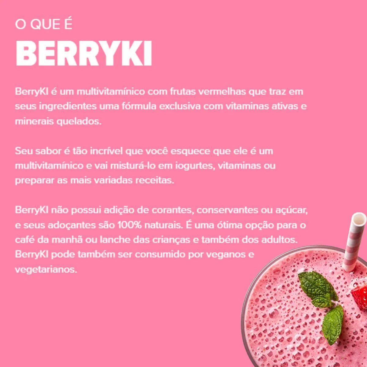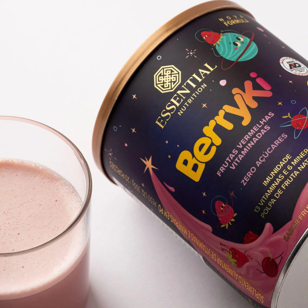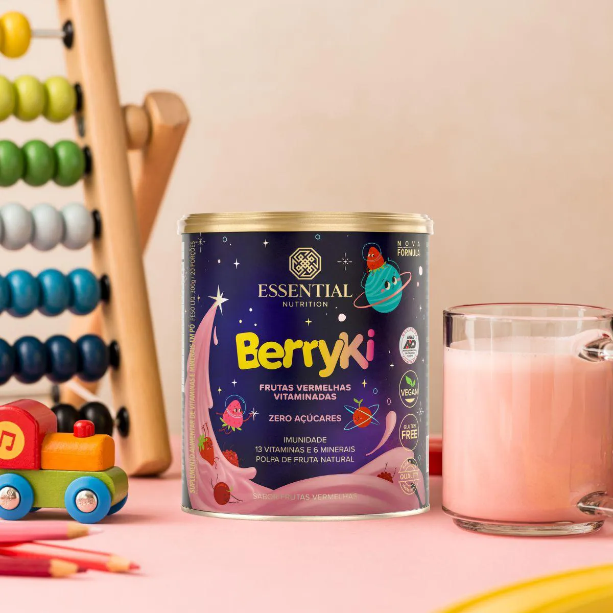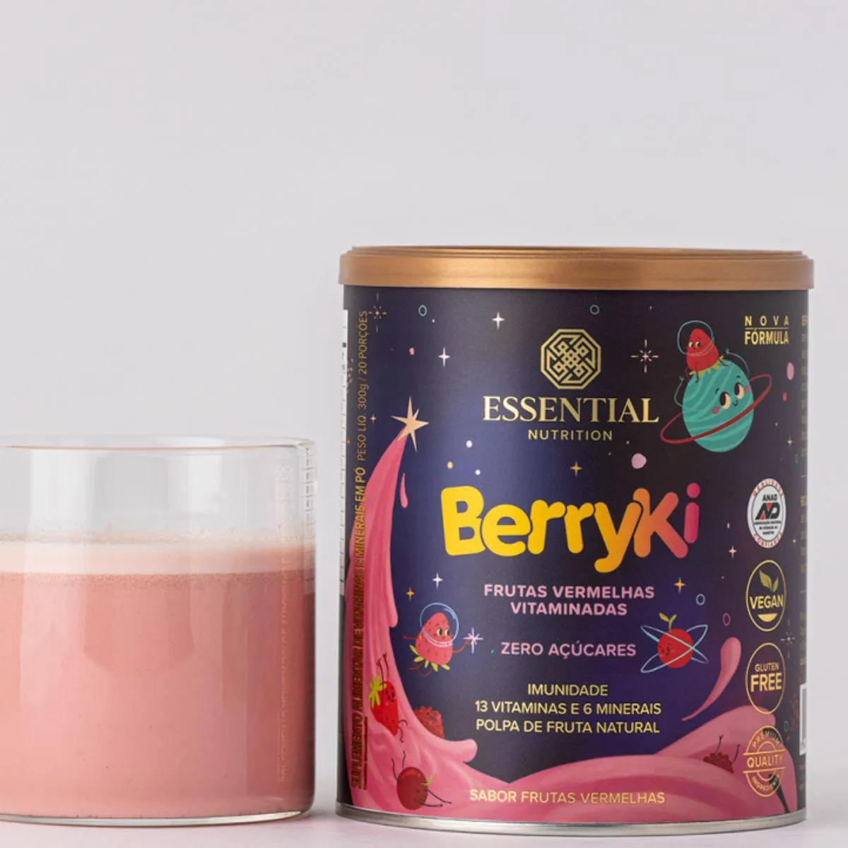 BerryKi Multivitamínico da Essential Nutrition é um suplemento em pó de 300 g com sabor frutas vermelhas, formulado para crianças. Combina vitaminas e minerais com extratos naturais, oferecendo uma bebida nutritiva e saborosa.