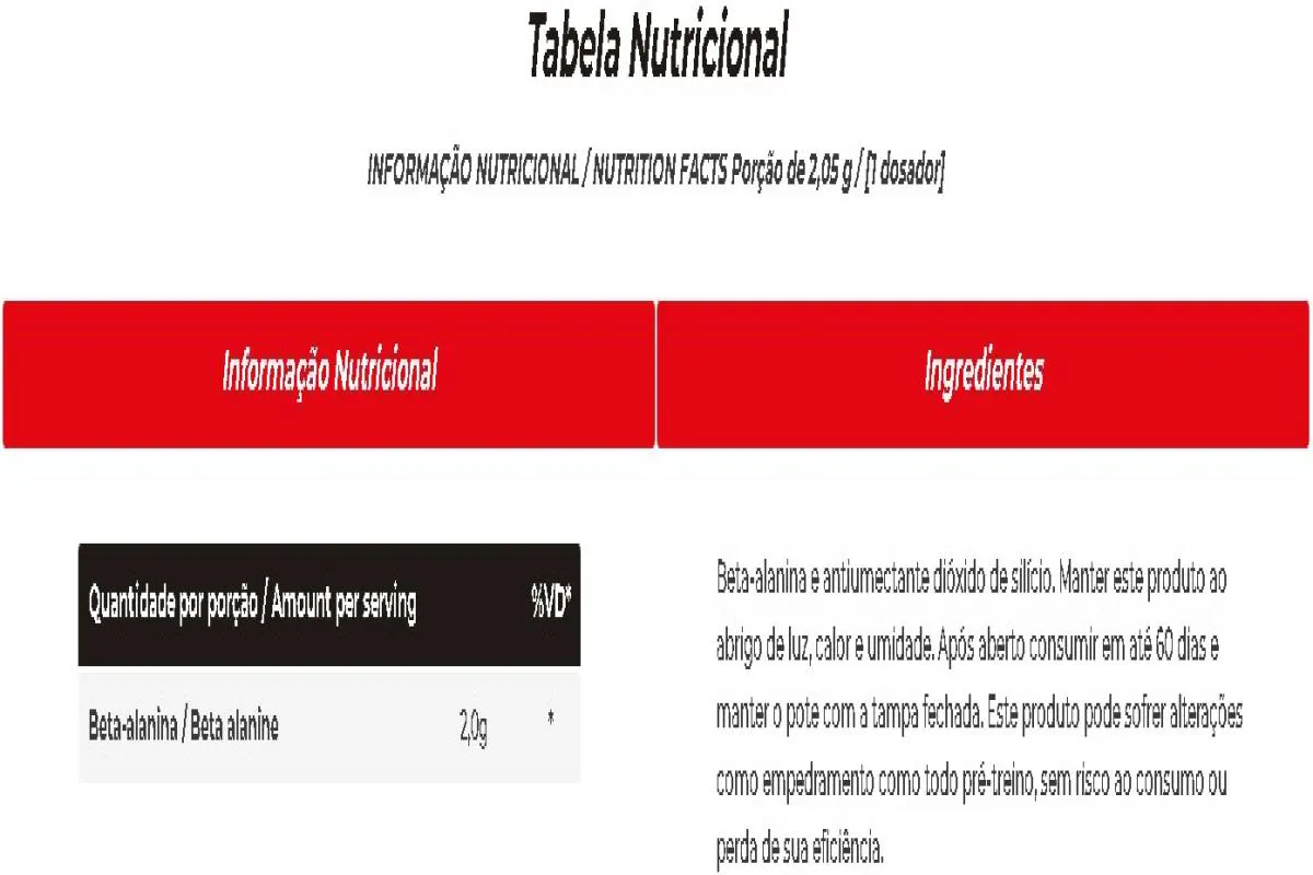 Beta-alanina e antiumectante dióxido de silício. Manter este produto ao abrigo de luz, calor e umidade. Após aberto consumir em até 60 dias e manter o pote com a tampa fechada. Este produto pode sofrer alterações como empedramento como todo pré-treino, sem risco ao consumo ou perda de sua eficiência.