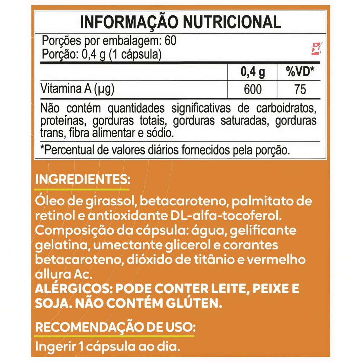 BETACAROTENO ALTO TEOR DE vitamina A 1 AO DIA 60 CÁPSULAS SOFTGEL - DUOM: MALTTA NUTRITION DESCRIÇÃO Fonte de vitamina A, contribui na proteção da pele contra os efeitos do sol e do envelhecimento precoce. Além de ajudar a manter e prolongar o bronze saudável. O betacaroteno é a fonte mais abundante de pró-vitamina A natural. Após a ingestão o organismo converte o betacaroteno em vitamina A de acordo com sua necessidade. Na natureza o betacaroteno possui como principais fontes: cenoura, abóbora, mamão, manga, batata doce. Também pode ser encontrado em alguns vegetais folhosos como a couve, repolho, espinafre, agrião e brócolis. Alimentos ricos em ômega 3, licopeno e vitamina c melhoram a absorção do betacaroteno. O betacaroteno desempenha um papel importante como antioxidante, eliminando os radicais livres. A vitamina A também é responsável pelo desenvolvimento de tecidos epiteliais, auxiliando na formação da melanina, na melhora da pele e no bom funcionamento da visão. BENEFÍCIOS - Auxilia a evitar o envelhecimento da pele; - Protege contra os raios ultravioletas; - Funciona como antioxidante; - Promove um belo bronzeamento.; - Auxilia na visão; - Auxilia na função do sistema imune; - Auxilia no metabolismo do ferro; - Auxilia na manutenção de mucosas; - Auxilia no processo de diferenciação celular. SUGESTÃO DE USO Ingerir 1 cápsula ao dia após o café da manhã ou almoço. TABELA NUTRICIONAL & COMPOSIÇÃO Anexo nas imagens. RECOMENDAÇÕES colorido Artificialmente. PRODUTO INDICADO A PESSOAS ACIMA DE 19 ANOS. ESTE PRODUTO NÃO É UM MEDICAMENTO. NÃO EXCEDER A RECOMENDAÇÃO DIÁRIA DE CONSUMO INDICADA NA EMBALAGEM. MANTENHA FORA DO ALCANCE DE CRIANÇAS. DADOS TÉCNICOS Marca – Duom: MALTTA NUTRITION. Conteúdo líquido total – 60 cápsulas. Rendimento total – 60 porções/doses. Peso líquido por frasco – 15g. Peso líquido total – 24g. Peso bruto total – 65g. Peso aproximado produto + embalagem - 150g. Código de barras (EAN) – 7898938440509. Registro ANVISA – Dispensado de registro de acordo com a resolução da RDC 240/2018 da ANVISA. Dimensões do produto – largura: 6 cm; altura: 10 cm; comprimento: 6 cm. Dimensões da embalagem/pacote - largura: 13 cm; altura: 7 cm; comprimento: 16 cm. ITENS DO ANÚNCIO - 1 Unidade do produto: BETACAROTENO ALTO TEOR DE VITAMINA A 1 AO DIA 60 CÁPSULAS SOFTGEL - DUOM: MALTTA NUTRITION. Total – 60 Cápsulas POR FRASCO.