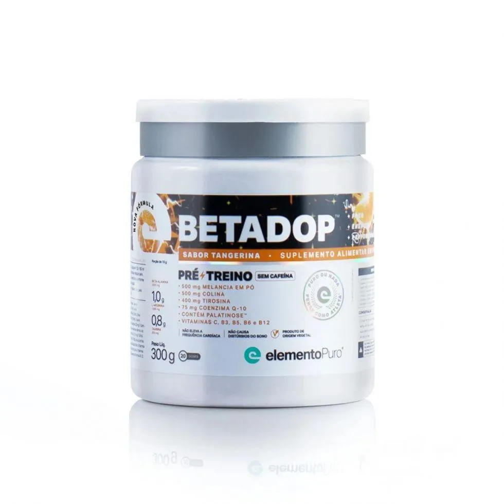 BetaDop (300g) – Elemento Puro Obtenha mais foco, energia e desempenho durante seus treinos, com BetaDop! BetaDop™ é o pré-treino ideal para atividades físicas de alta intensidade, onde a frequência cardíaca já é elevada naturalmente e, para quem costuma treinar a noite, não causa distúrbios do sono, pois foi desenvolvido com ingredientes que estimulam o treino sem os efeitos indesejáveis da cafeína como arritmia, ansiedade, insônia e aumento da frequência cardíaca. Fator muito importante que, aliado aos micronutrientes de BetaDop™, proporcionam uma melhor recuperação física e mental ao atleta. O objetivo de BetaDop™ é fornecer energia de forma equilibrada e prolongada para os músculos e o cérebro, favorecer a utilização da gordura corporal e de ácidos graxos como fontes de energia, promover resistência, melhora no rendimento físico e mental, acelerar a recuperação do atleta e não gerar ansiedade e taquicardia. Benefícios:* Fornece energia;* Promove resistência;* Auxilia na recuperação;* Disposição nos treinos. v