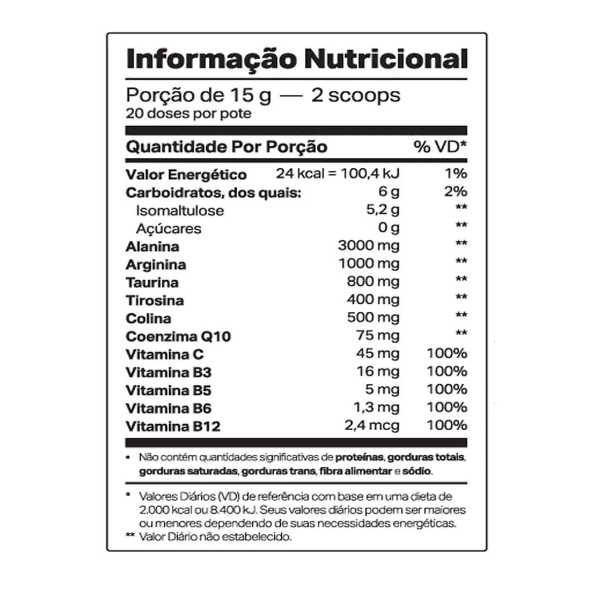 Isomaltulose (Palatinose), Alanina (3000mg/150ml), Arginina (1000mg/150ml), Taurina (800mg/150ml), Glucoronolactona (860mg/150ml), Colina (500mg/150ml), Melancia em pó (500mg/150ml), Tirosina (400mg/150ml) , Inositol (70mg/150 ml), Matchá (200mg/150ml - chá verde integral - Camelia Sinensis), aromatizante idêntico ao natural, acidulante ácido cítrico, Coenzima Q10 (75mg/150ml), isomalte, corantes naturais (INS 162) e (INS 160b), edulcorantes sucralose a acessulfame de potássio, ácido ascórbico (vitamina C), Nicotinamida (Vitamina B3), Pantotenato de cálcio (Vitamina B5), Piridoxina (Vitamina B6) e Cianocobalamina (Vitamina B12). NÃO CONTEM GLÚTEN. NÃO CONTÉM LACTOSE. ...