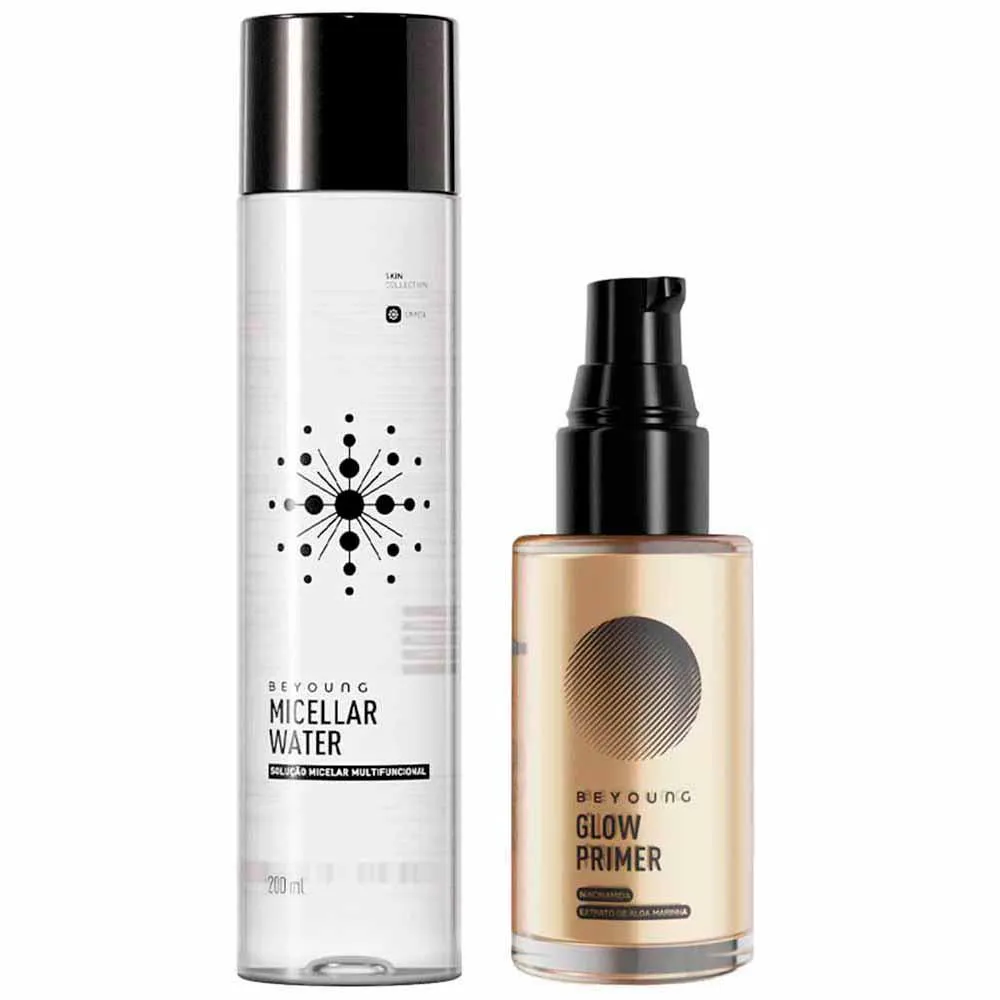 A Água Micelar Beyoung Micellar Water remove impurezas e maquiagem resistente, enquanto o Primer Facial Firmador Beyoung Glow proporciona um efeito lifting imediato e prepara a pele para receber a maquiagem, garantindo um acabamento perfeito.