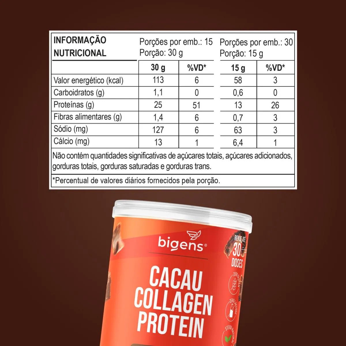 Este produto não é um medicamento. Não exceder a recomendação diária de consumo. Produto indicado para maiores de 19 anos.Suplemento alimentar dispensado de registro conforme RDC nº 240/2018. Bigens Cacau Collagen Protein: sabor, qualidade e proteína para complementar sua rotina com eficiência e praticidade!