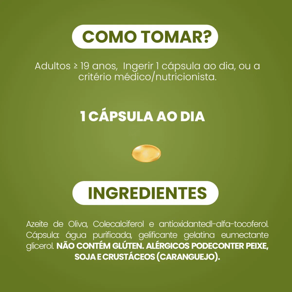 Quando falamos em vitamina d, na verdade falamos de forma geral de um complexo de cinco hormônios, as vitaminas D1, D2, D3, D4, D5. Todas possuem estruturas semelhantes e participam de processos fisiológicos no organismo. Porém, dentre estes 5 compostos, duas formas são as mais importantes a nível de saúde humana: a Vitamina D3 (colecalciferol) e a Vitamina D2 (ergocalciferol). Ambas são compostos inativos e precisam passar por processos químicos para se tornarem ativas e exercerem seu papel. Quimicamente, o que difere a vitamina D3 da D2 são suas cadeias laterais no carbono 17. Na prática, podemos considerar a vitamina D2 de origem vegetal e a vitamina D3 de origem animal, onde a vitamina D3 é a melhor e mais potente. O Azeite de Oliva, por sua vez, é uma fonte natural de gorduras saudáveis, especialmente ácidos graxos monoinsaturados, que ajudam na absorção da Vitamina D3 e promovem diversos benefícios à saúde, como a melhora da função cardiovascular e ação anti-inflamatória. SUGESTÃO DE USO: A recomendação é de 1 (uma) cápsula ao dia, para adultos acima de 19 anos.