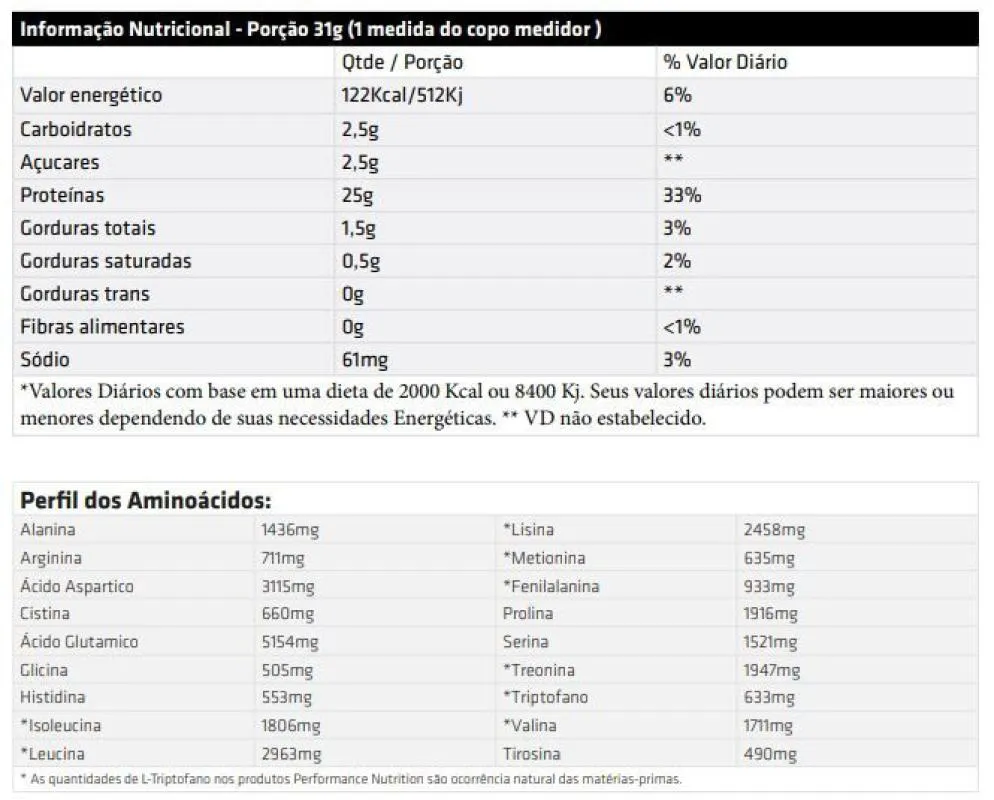 Bio whey protein (2Kg) - Performance Nutrition 4 Filtragens distintas de Whey Protein: Bio Whey Protein® foi formulado com um blend proteico de alto valor biológico: Whey Protein Hidrolisado, que fornece 99% de absorção pelo organismo, Whey Protein Isolado - Ion Exchange (Carga Iônica) / Whey Protein Isolado - Microfiltrado, fornecem 98% de absorção e Whey Protein Concentrado, que fornece 80% de absorção pelo organismo. 25g de Proteína por Porção: Bio Whey Protein® fornece em cada porção 25g de proteína com os 4 tipos distintos de filtragem do Whey Protein. 6,5g de bcaa's: Por uma ocorrência natural, Bio Whey Protein® libera um perfil diferenciado de aminoácidos, principalmente de BCAA’s (Aminoácidos de Cadeia Ramificada), sendo que 3g dos quais são de Leucina. Os 2,5g de Carboidratos são ocorrência natural dos ingredientes do Bio Whey Protein: Proteínas, Aromatizantes e Processo de Instantaneização.Benefícios:* 25g de proteína por dose;* Ajuda a prevenir o catabolismo muscular;* Auxilia no ganho e manutenção de massa muscular;* Melhora o rendimento e a performance durante os treinos;* 14g de aminoácidos essenciais por dose - sendo 6,5g de BCAA;* Baixos teores de sódio.