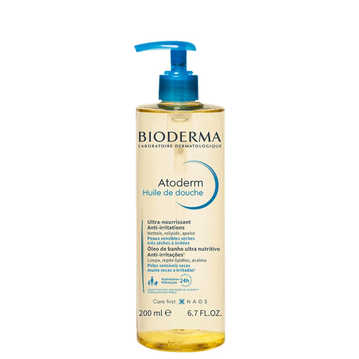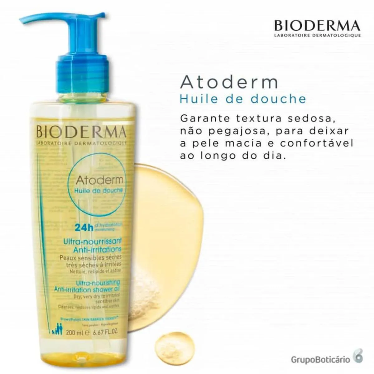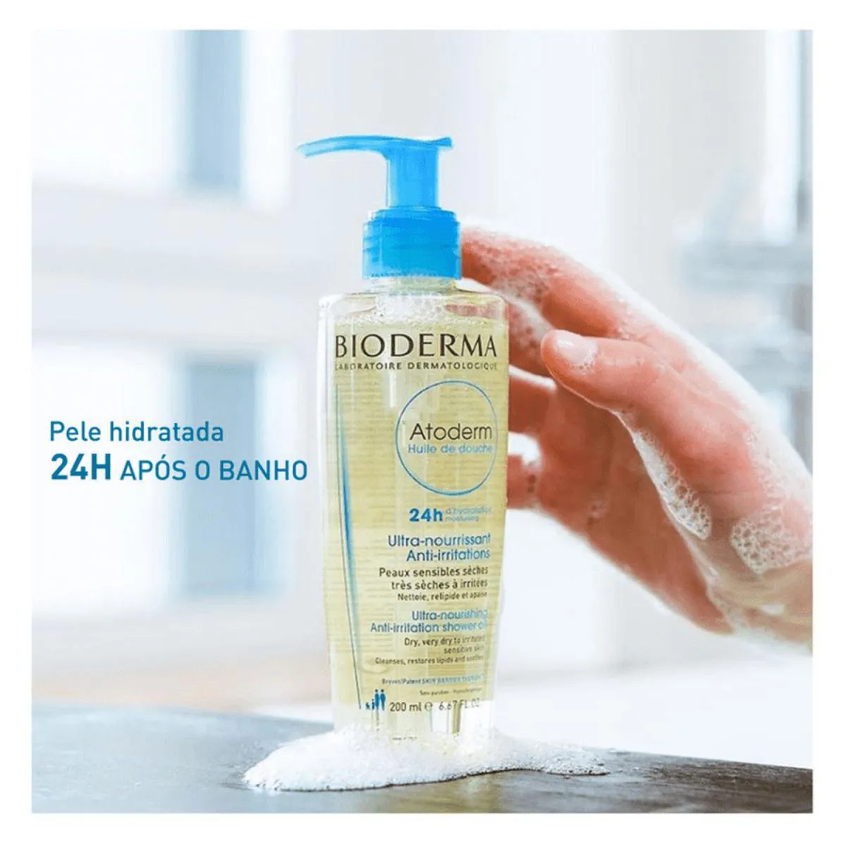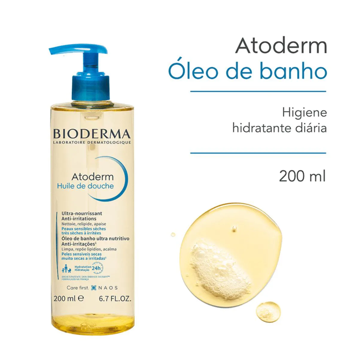 Óleo corporal de banho para peles secas ou ressecadas. Óleo de Banho Hidratante Bioderma Atoderm nutre, acalma a irritação e hidrata por 24 horas, além de proteger efetivamente contra a ação danosa de agressões externas. O Óleo de Banho Bioderma Atoderm conta com ingredientes ativos e moléculas puras que, em sua maioria, já estão presentes naturalmente na pele. Com fórmula inteligente e exclusiva, composta por Biolipídios Vegetais (coco e éster de girassol), Niacinamida e a patente Skin Barrier Therapy™, o produto combate a sensação de repuxamento, fortalece a resistência cutânea e reestrutura a barreira de proteção. Também melhora a tolerância da pele, assegura sensação imediata de conforto e higieniza sem agredir. Possui uma ótima tolerância cutânea e ocular. Não provoca acne e promove uma espumação suave.