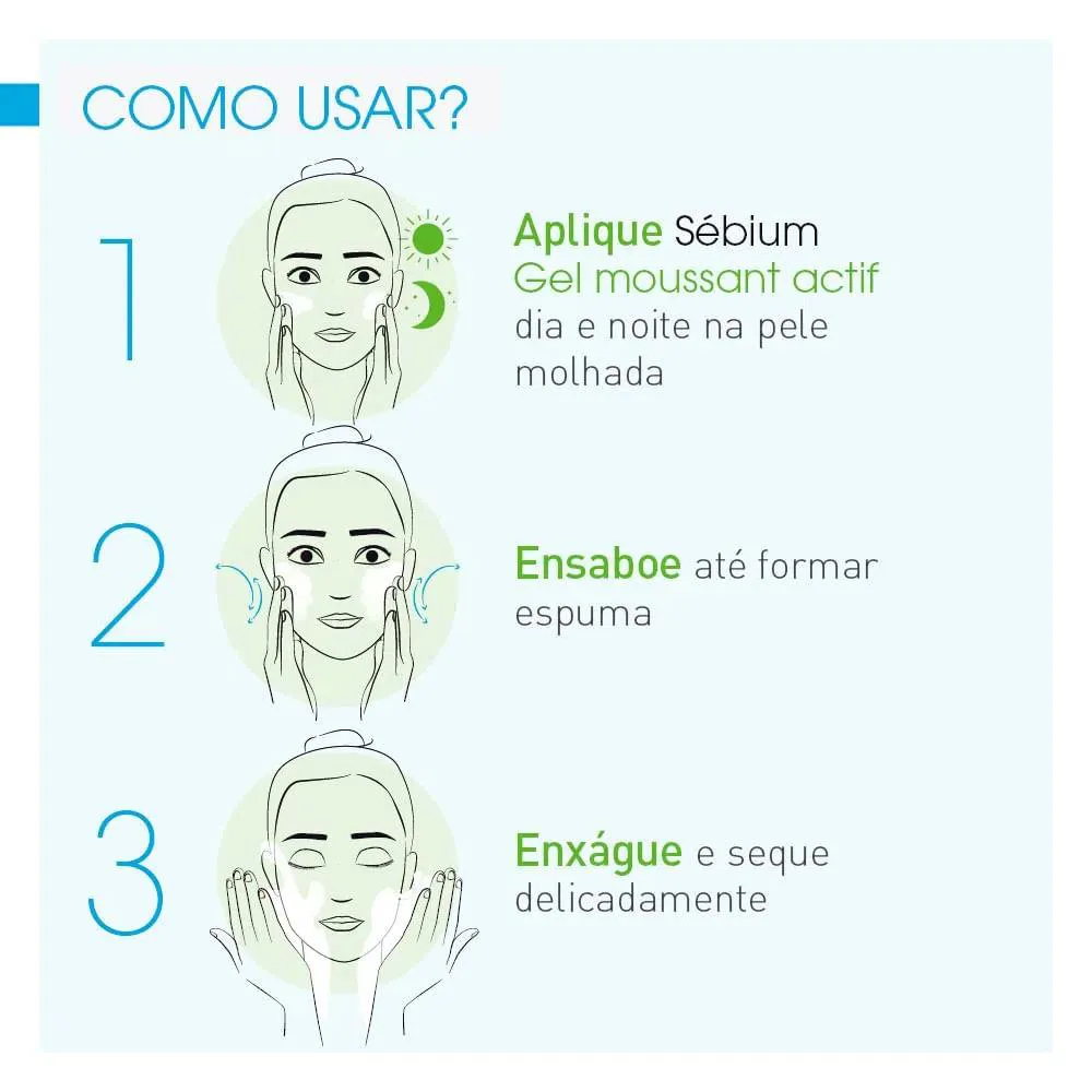 Sébium Gel Moussant Actif (Gel de Limpeza) combina dois ativos renovadores (ácido glicólico + ácido salicílico) que limpam profundamente e purificam a pele acneica sem ressecar. O Gluconato de zinco limita a secreção de sebo e a acne.