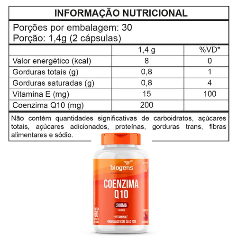 INGREDIENTES: Triglicerídeos de Cadeia Média, Coenzima Q10, Acetato de DL Alfa Tocoferol e emulsificante: Lecitina de soja INS 322. Ingredientes da cápsula: água purificada, gelificante gelatina bovina INS 428, umectantes glicerina INS 422, e sorbitol líquido INS 420, Corante Natural Carmim INS 120 e Corante INS 171. "NÃO CONTÉM GLÚTEN". ALÉRGICOS: CONTÉM DERIVADOS DE SOJA. PODE CONTER DERIVADOS DE PEIXE. SUGESTÃO DE USO: Adultos 19 anos, ingerir 2 cápsulas ao dia ou conforme a orientação de médico ou nutricionista. Conservar este produto bem fechado, em lugar fresco, seco e ao abrigo da luz. Após aberto consumir em até 90 dias.