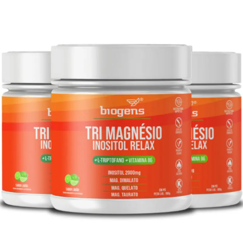 TRI MAGNÉSIO INOSITOL RELAX LIMÃO L-triptofano + vitamina B6 + MAGNÉSIOS DIMALATO, QUELATO E TAURATO 180 GRAMAS Trimagnésio Inositol Relax Biogens é um suplemento formulado para uma excelente absorção no organismo. Tem em sua composição L-Triptofano, Inositol e Vitamina B6 além das 3 formas especiais de magnésio, sendo estes, Magnésio Dimalato que vem da associação a duas moléculas de ácido málico, Magnésio Quelato ou Bisglicinato vem da associação a duas moléculas de aminoácidos glicina e o Magnésio Taurato que vem da associação ao aminoácido de taurina. Essas associações tornam o mineral biodisponível e atuam diretamente no aumento da velocidade de absorção.