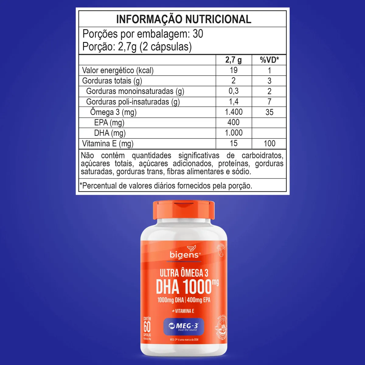 Ultra Ômega 3 DHA 1000mg EPA 400mg Meg-3® 60 Cápsulas Bigens