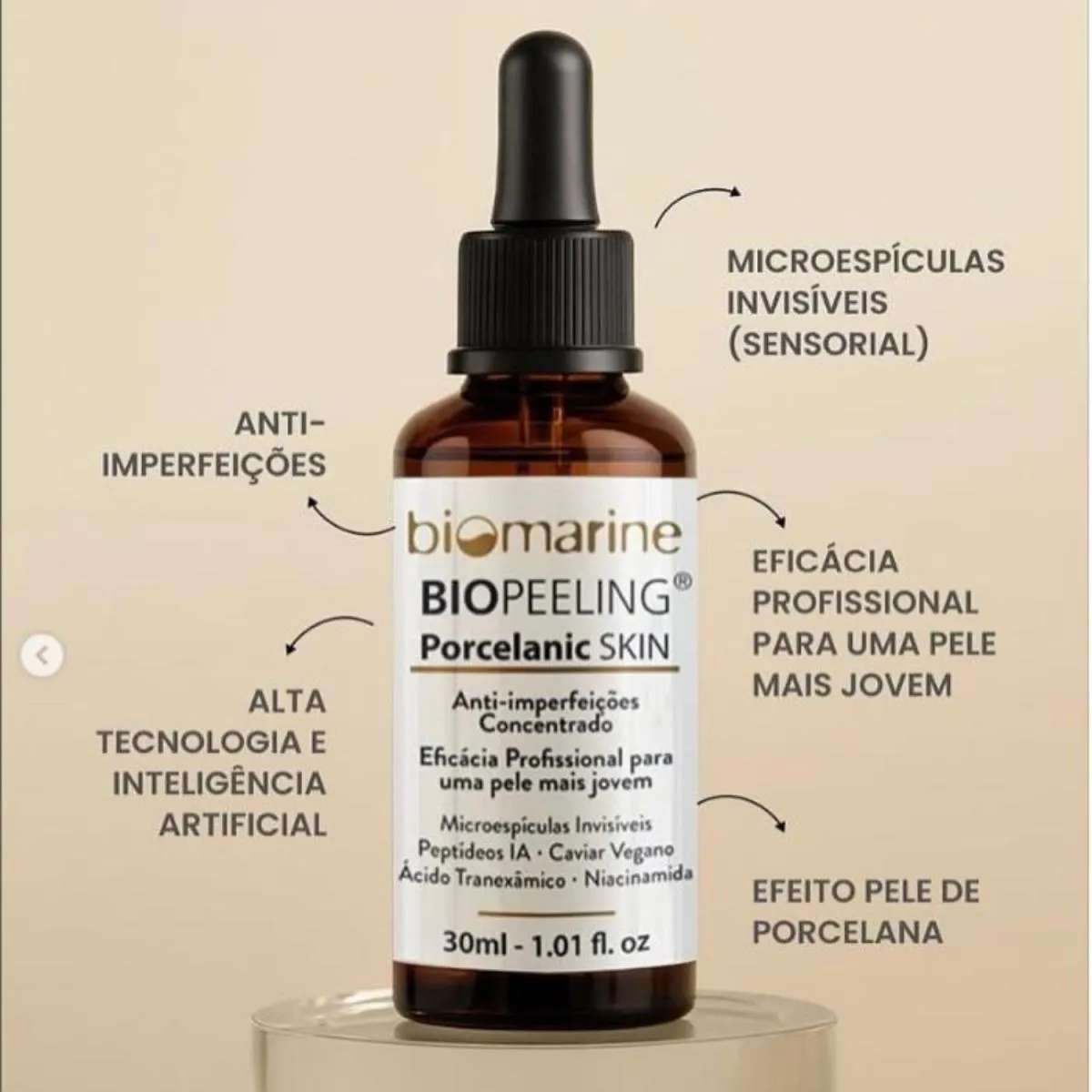 O Biomarine Biopeeling Porcelanic Skin é um concentrado anti-imperfeições com eficácia profissional, desenvolvido para promover uma pele mais uniforme, lisa e rejuvenescida. Sua fórmula conta com tecnologia de inteligência artificial e microesferas invisíveis que realizam uma esfoliação sensorial suave, auxiliando na renovação celular e na uniformização do tom da pele. Ideal para quem busca uma aparência de “pele de porcelana”, com toque aveludado e luminosidade natural. PRINCIPAIS ATIVOS