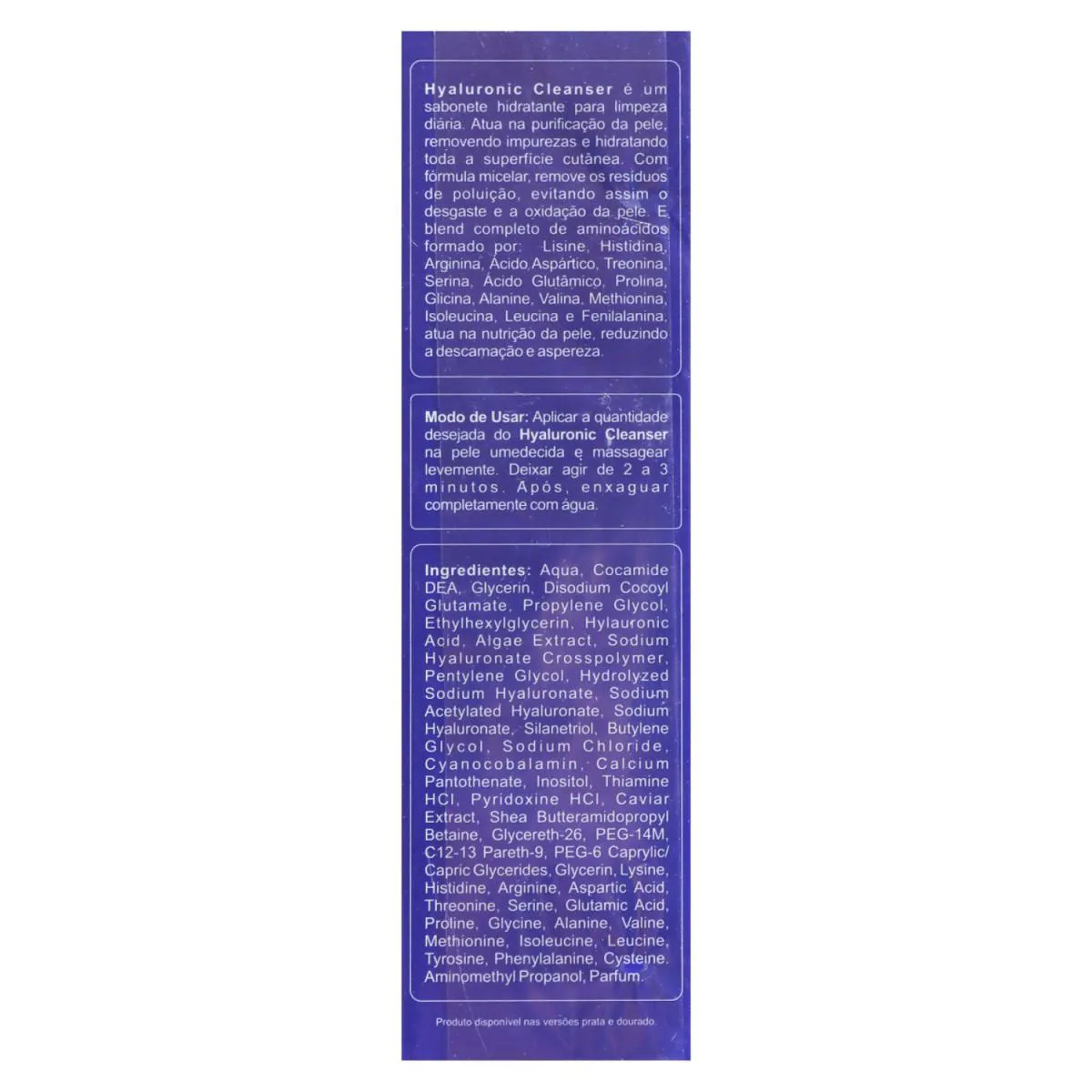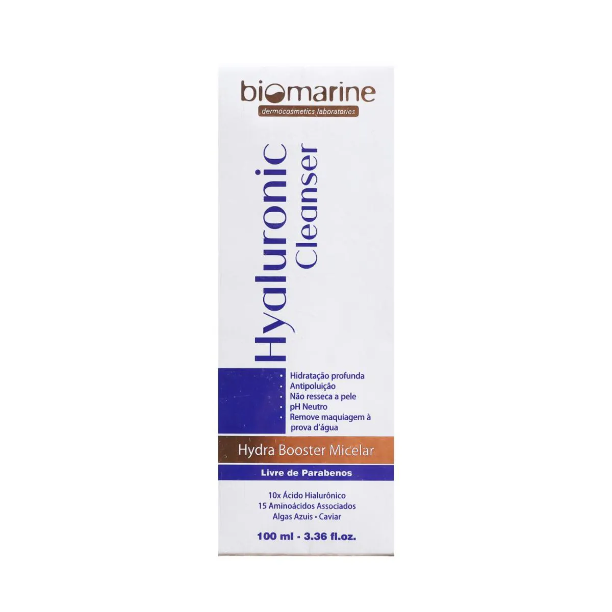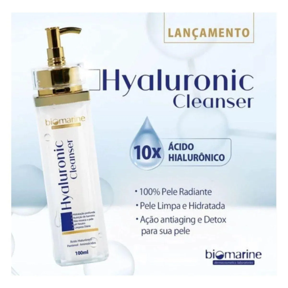 CARACTERÍSTICAS Sabonete líquido facial para todos os tipos de pele. Com tecnologia micelar, Biomarine Hyaluronic Cleanser limpa profundamente a pele, removendo impurezas, resíduos de poluição e maquiagem. Livre de parabenos, tem ação detox e antifadiga para um efeito de pele revitalizada e descansada. Biomarine Hyaluronic Cleanser conta com 10 tipos de Ácido Hialurônico que atuam na hidratação intensa. Assim, oferece limpeza eficaz sem ressecar a pele. PRINCIPAIS ATIVOS Ácido Hialurônico, Aminoácidos, Algas Azuis, Caviar MODO DE USO Umedeça a face, coloque o sabonete nas mãos e esfregue uma na outra para fazer espuma. Aplique no rosto e massageie suavemente. Enxágue bem. Rentabilidade: Média de 150 aplicações