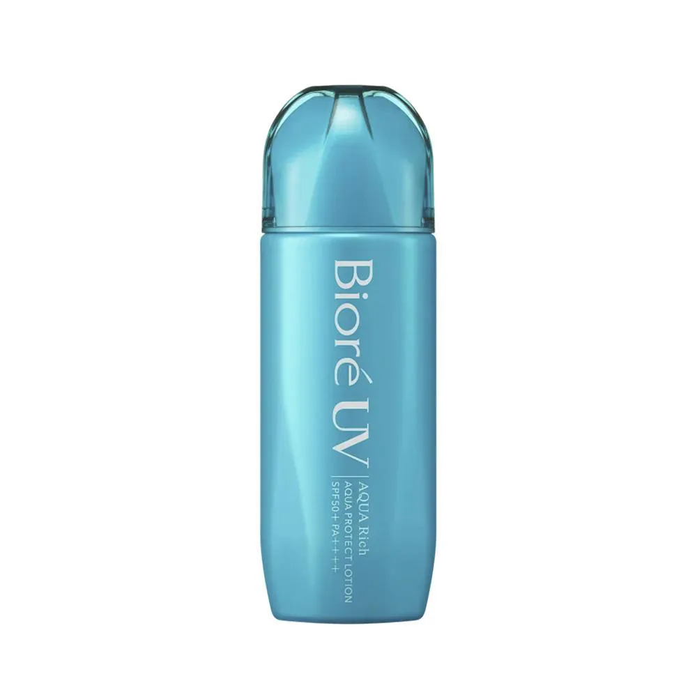protetor solar facial e corporal. Bioré UV Aqua Rich Aqua Protect Lotion, fórmula ideal para peles muito sensíveis à queimadura solar. O Protetor Solar Bioré UV Aqua Rich Aqua Protect Lotion espalha facilmente como água e forma um filme fino de proteção UV de rápida absorção. Ele é composto por cápsulas de água feitas de ágar-ágar, que contém filtros químico UV, derretem e aderem rapidamente à pele, cobrindo-a uniformemente, sem deixar resíduos brancos. Com ingredientes hidratantes como Ácido Hialurônico, Extrato de Geleia Real e Glicerina, ele deixa a pele super hidratada. Além disso, pode ser usado com a maquiagem e possui fórmula não comedogênica.
