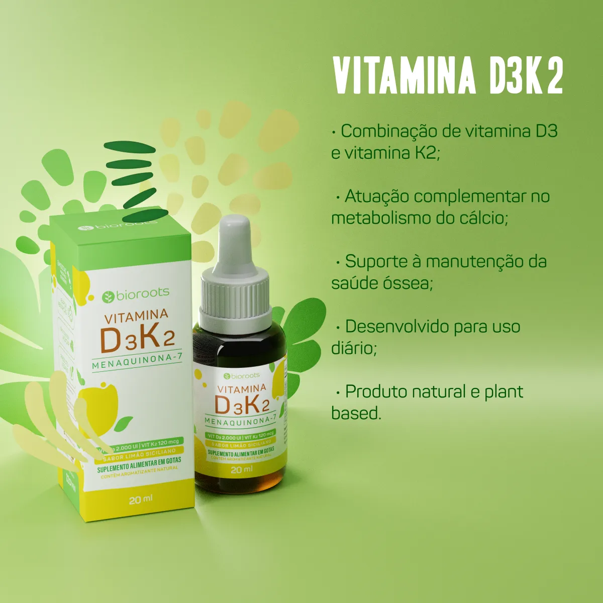 - A Vitamina D3 + K2 Bioroots é usada para auxiliar a saúde óssea e o equilíbrio do organismo.