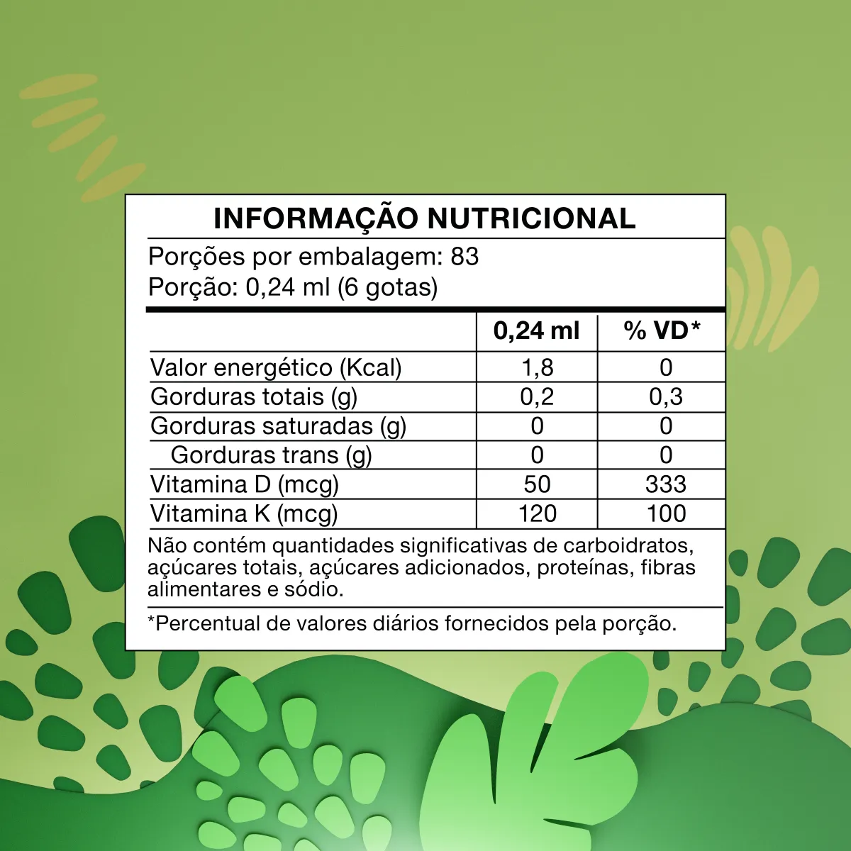 Vitamina D3 de origem vegetal, vitamina K2 e base oleosa.