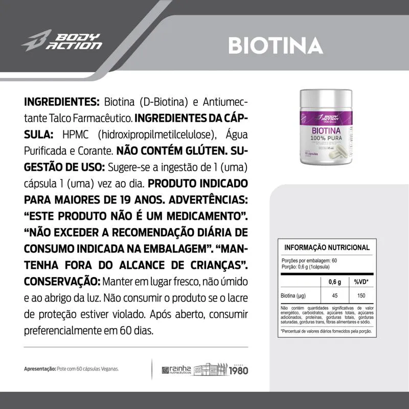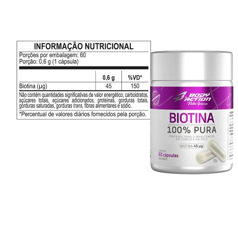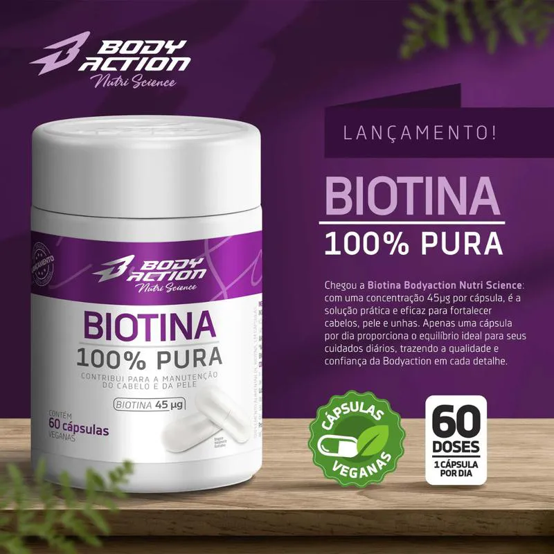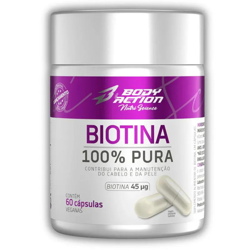 Biotina 100% Pura 45Mcg 60 Cápsulas Body Action Manuteção Cabelo e Pele
