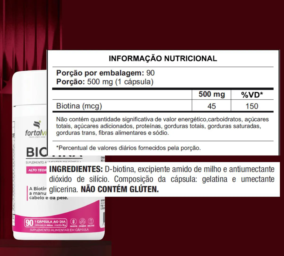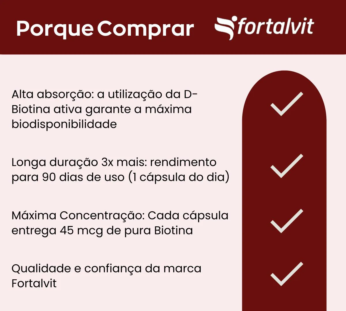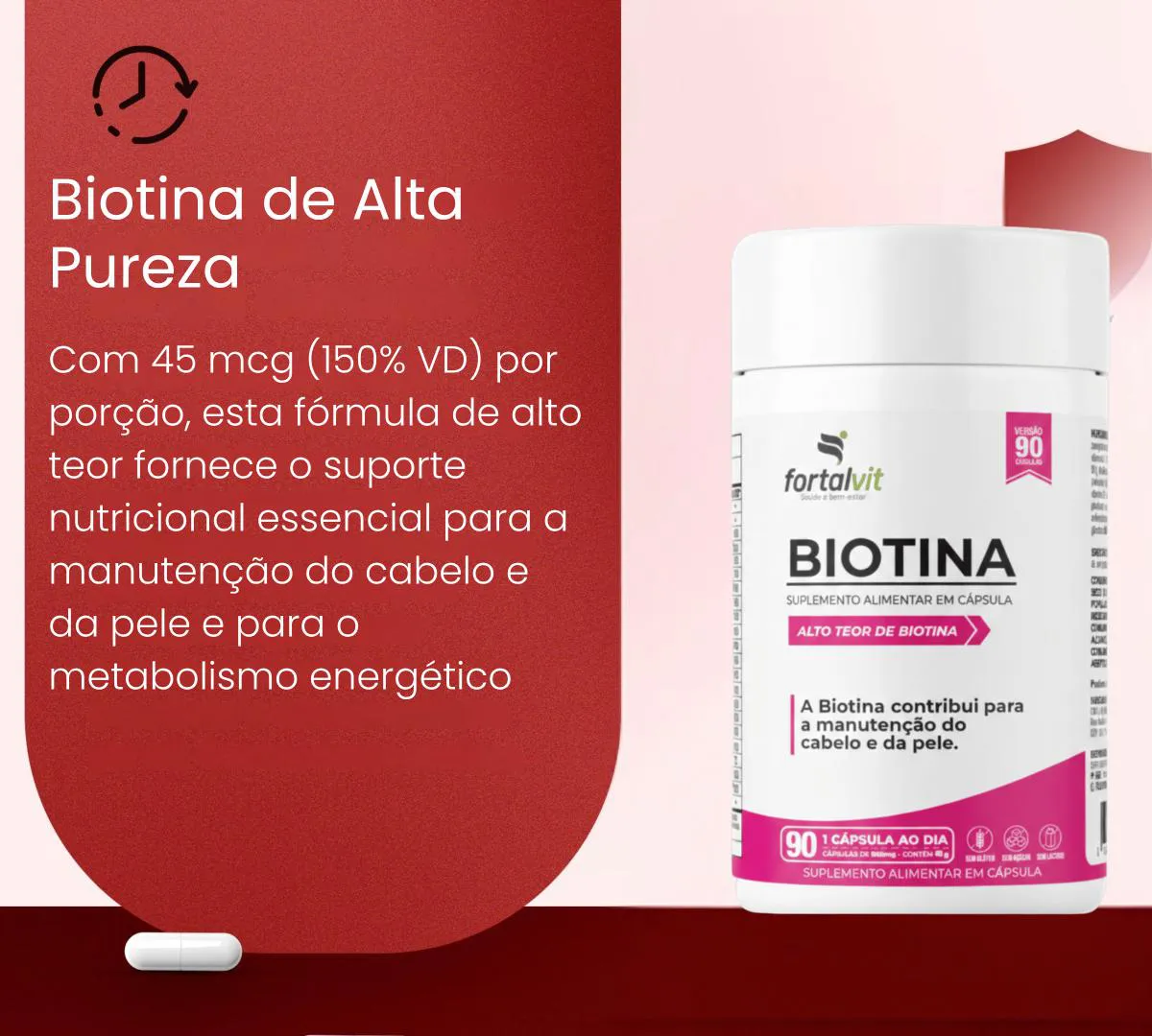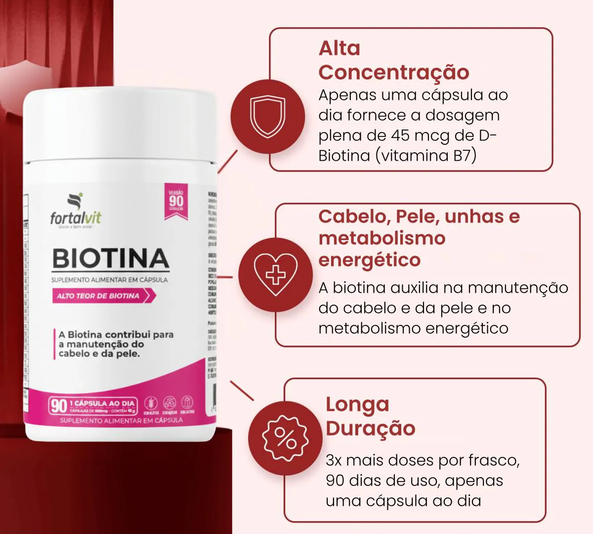 Biotina Pura 45mcg (150% VD) Dose Máxima, 90 Cápsulas, 3 Meses de Uso, Longa Duração, Suporte à Manutenção de cabelo, Pele e Unhas, Fortalvit