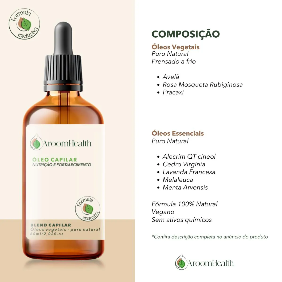 Fórmula Exclusiva AroomHealth Revitalize seus cabelos com o poder do nosso blend exclusivo de óleos vegetais puro natural prensados a frio, garantindo máxima pureza e eficácia. A combinação perfeita dos óleos de Avelã, Pracaxi e Rosa Mosqueta Rubiginosa nutre profundamente o couro cabeludo e os fios desde a raiz até as pontas, promovendo um crescimento saudável e natural. Enriquecido com óleos essenciais puro natural de Alecrim QT Cineol, Cedro Virgínia, Lavanda Francesa, Melaleuca e Menta Arvensis, este blend proporciona brilho radiante, combate a queda e fortalece o bulbo capilar, deixando os cabelos mais resistentes, hidratados e com um aroma sofisticado e refrescante.