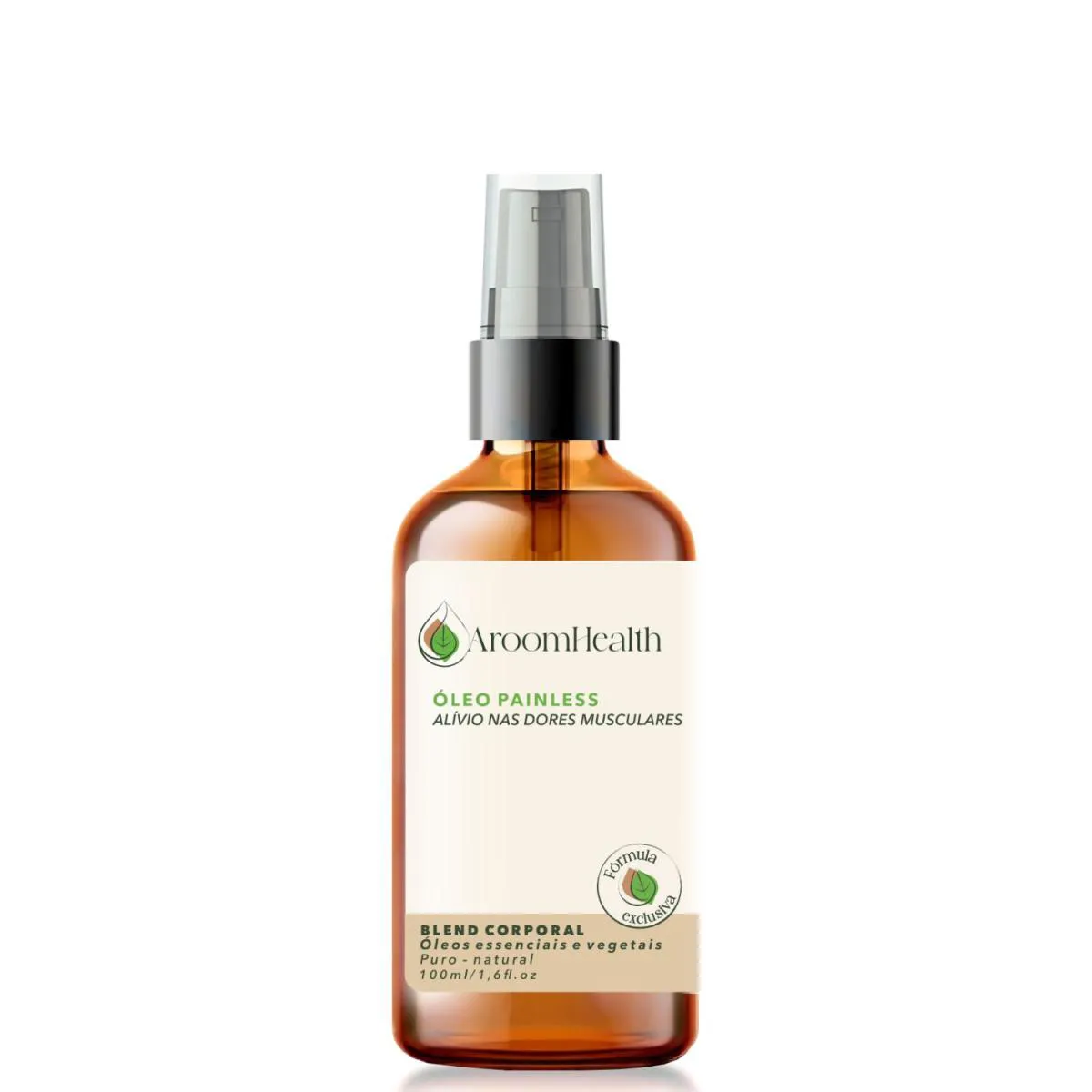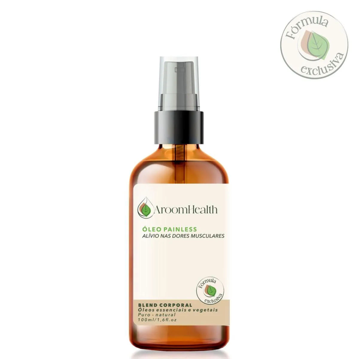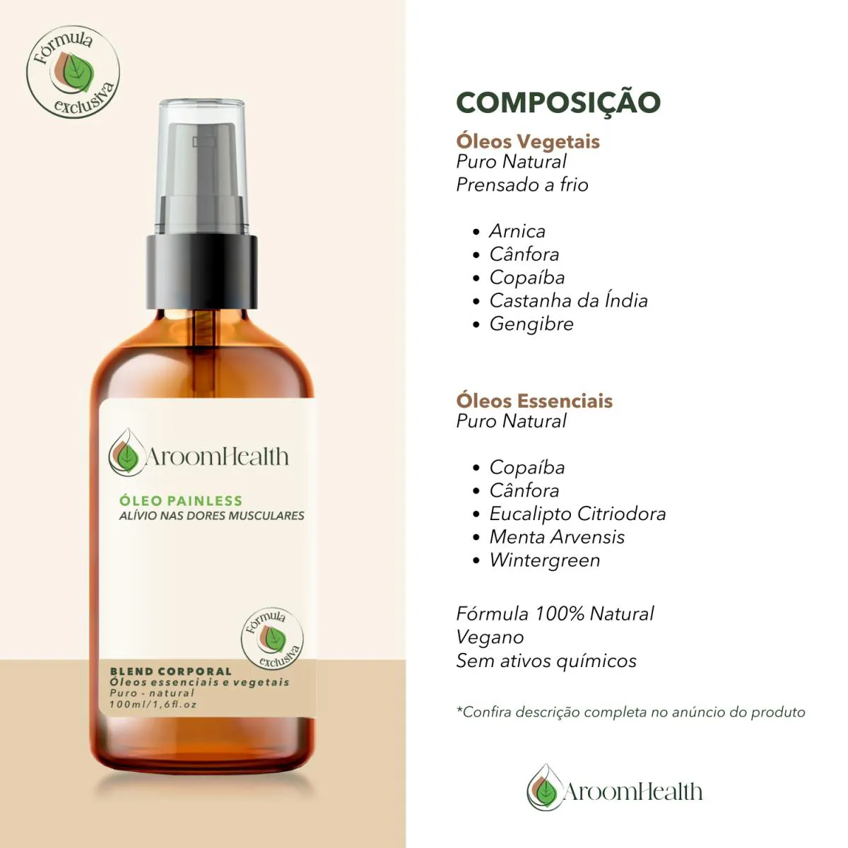 Fórmula Exclusiva AroomHealth O Blend de Óleos Painless foi desenvolvido com uma sinergia potente de óleos essenciais e vegetais que auxiliam naturalmente no alívio de dores físicas, musculares e articulares. Sua fórmula exclusiva combina óleos puro natural cuidadosamente selecionados que proporcionam alívio rápido e eficaz das dores, ajudando a relaxar a musculatura e promover bem-estar físico. Ideal para quem sofre com dores no nervo ciático, artrite, bursite, torções, cãibras, pernas cansadas e para o pós-treino, oferecendo uma sensação imediata de conforto e relaxamento. Composição: