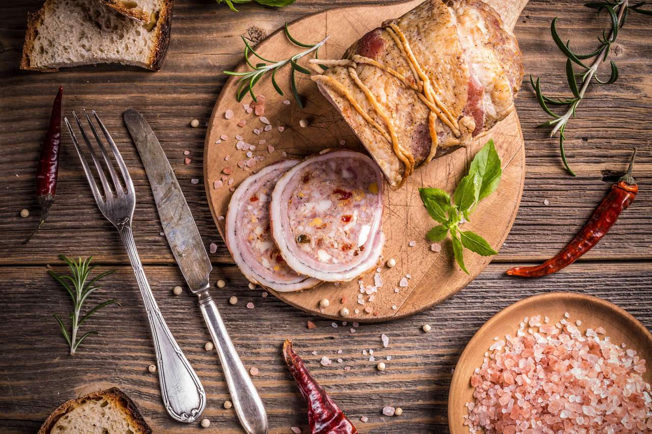 Então, coloque essa mistura em cima dos peitos de frango e enrole como um rocambole. Cubra com as fatias de presunto cru em seguida, coloque em uma assadeira e leve ao forno por cerca de 30 minutos ou até que esteja dourado.