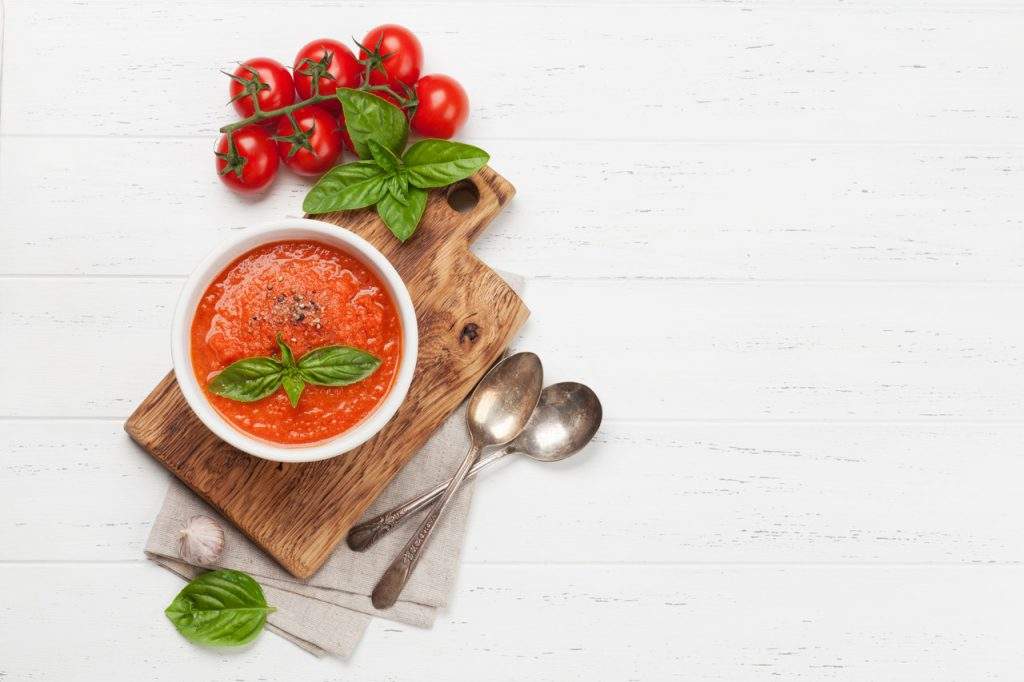O gazpacho é uma sopa fria bastante tradicional, além disso, é fácil de fazer. Primeiramente, corte os tomates, a cebola, o pepino e os dentes de alho. Em seguida, junte as fatias de pão, o azeite e o sal. Para formar um creme, bata tudo no liquidificador e, por fim, leve à geladeira.