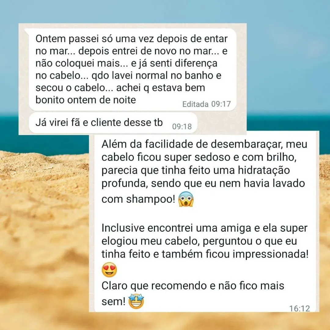 O QUE SÓ ELE ENTREGA?- 5 FORMAS DE PROTEÇÃO: protege contra os danos do Sol, do Sal, do Cloro, oferece proteção térmica e protege a cor do seu cabelo;- Brilho e Maciez imediatos;- Hidrata, nutre e sela os fios;- Alinhamento dos fios;- Desembaraça e facilita o pentear;- Evita os danos na queratina, que deixam o cabelo quebradiço e ressecado;- O cabelo dos sonhos desde o primeiro uso.