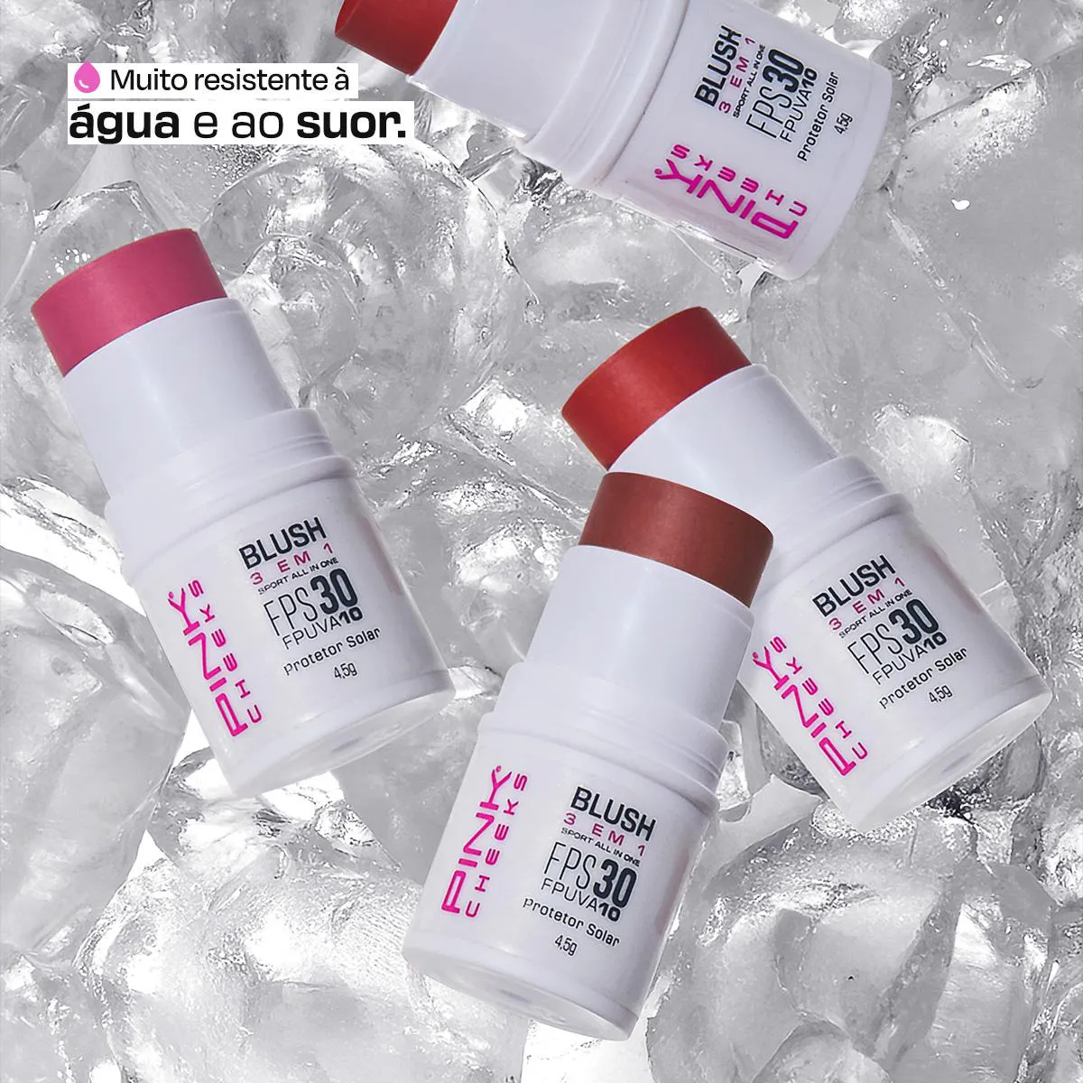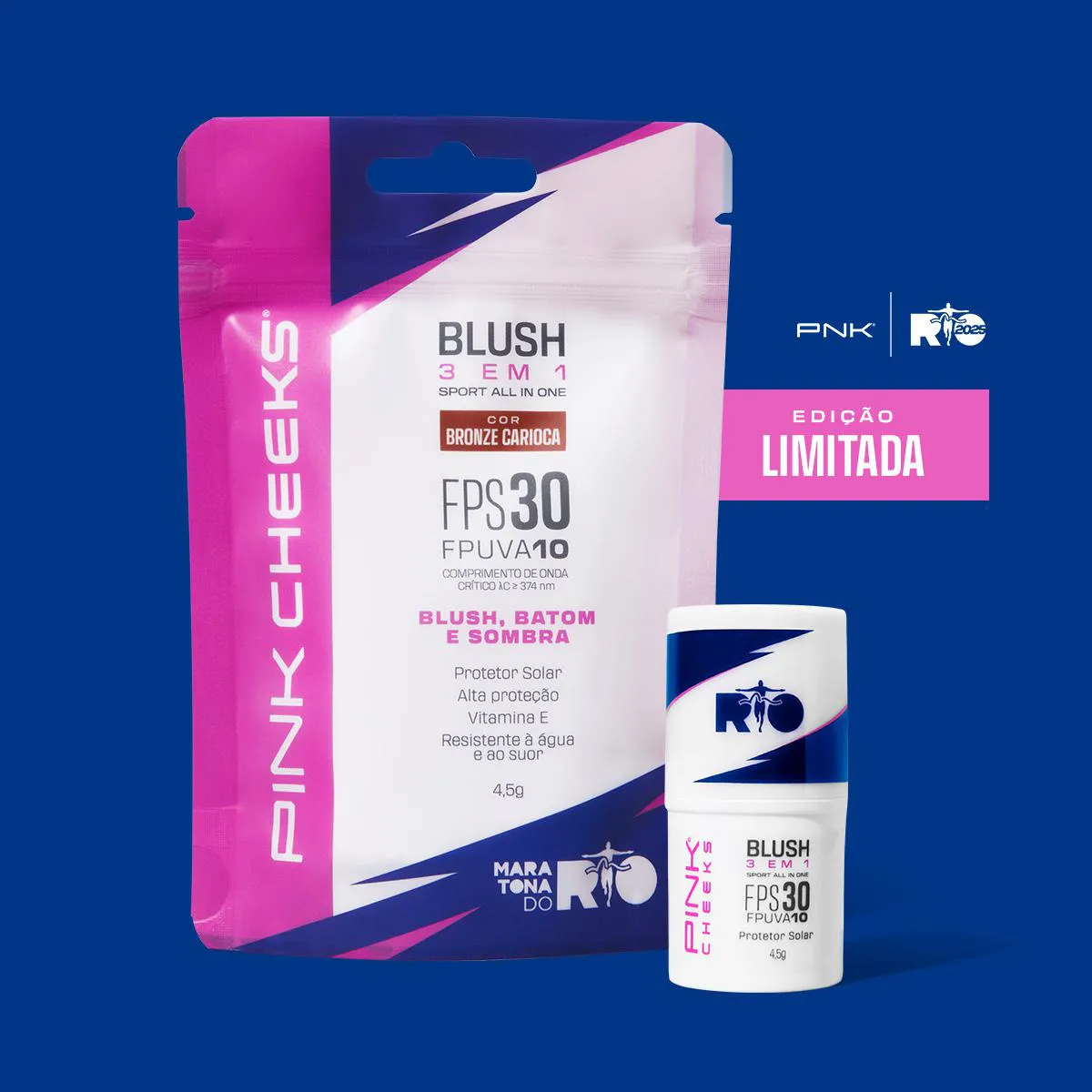 O Sport All In One faz parte da Linha Sport Make Up e é um produto multifuncional - pode ser aplicado como blush, batom e sombra. Este produto foi finalista no Beauty Industry Awards, realizado na In-Cosmetics Amsterdam em 2018, como o melhor produto com cor na categoria "indie brand". Com sensorial leve e sedoso, não deixa residual oleoso sobre a pele. É enriquecido com vitamina e, que confere hidratação e combate os radicais livres. Composto por filtros solares nobres e resistência à água e ao suor, tanto químicos como físicos, garantem a proteção UV por tempo prolongado. Possui fator de proteção FPS 30 e FPUVA 10. A Sport Make Up veio para quebrar o paradigma de que maquiagem não combina com o esporte. Nossos produtos foram desenvolvidos para trazer proteção, conforto e beleza para a prática esportiva. A tendência athleisure está migrando para o universo da beleza e com o lançamento da linha Sport Make Up, a Pink Cheeks é a primeira empresa de cosméticos a trazer esse conceito para o mercado brasileiro. Os produtos a linha Sport Make Up aliam beleza e proteção solar, com benefício extra de resistência à água e ao suor, ou seja, não escorre e não borra na água ou em contato com o suor. Dados Técnicos