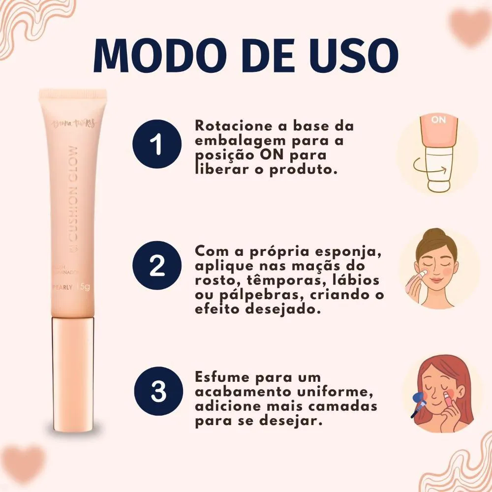 Modo de Uso/Aplicação Para iniciar o uso, gire a embalagem na posição ON. Aperte suavemente o corpo do produto até que o blush comece a sair na esponja aplicadora. Aplique diretamente nas áreas desejadas do rosto, como maçãs, têmporas, ou até mesmo nos lábios e pálpebras para um toque de cor e brilho. Após o uso, gire a embalagem para a posição OFF para garantir o fechamento e a conservação do produto.