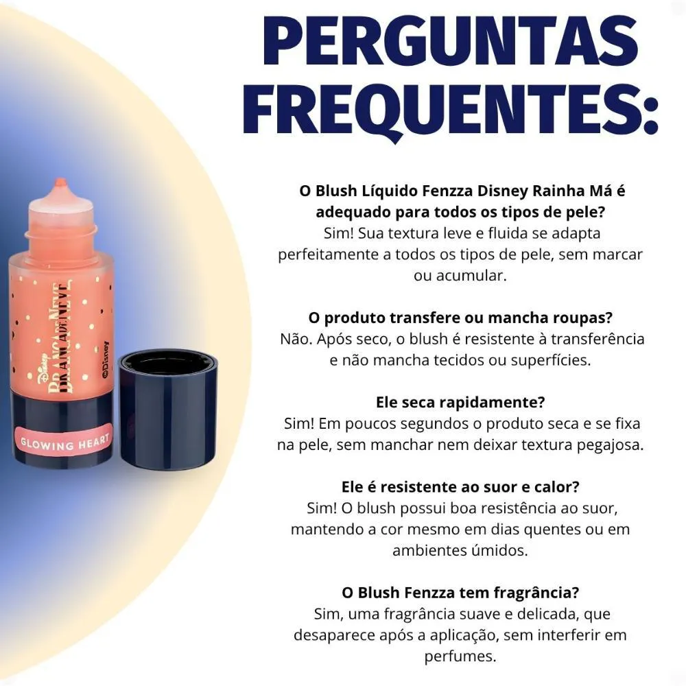 Modo de Uso/Aplicação Com a pele limpa e preparada, aplique uma pequena quantidade do Blush Líquido Fenzza Disney Branca De Neve Rainha Má nas maçãs do rosto. Utilize as pontas dos dedos, um pincel específico para blush líquido ou uma esponja para espalhar e esfumar o produto suavemente, construindo a intensidade desejada. Para um efeito mais natural, aplique o blush em camadas finas e esfume bem as bordas.