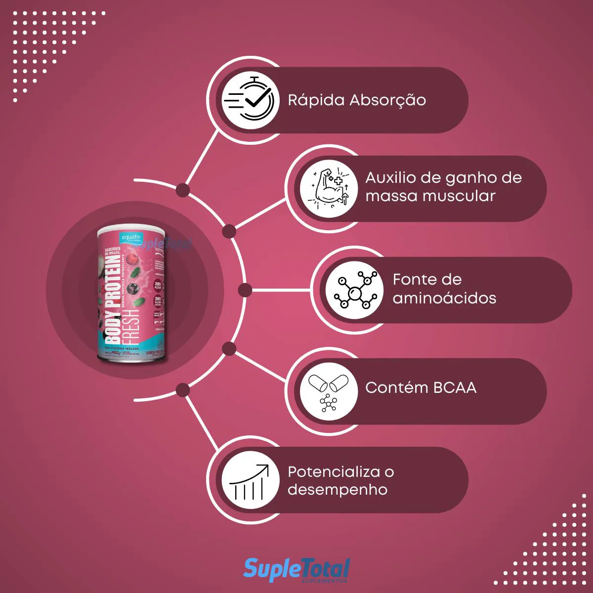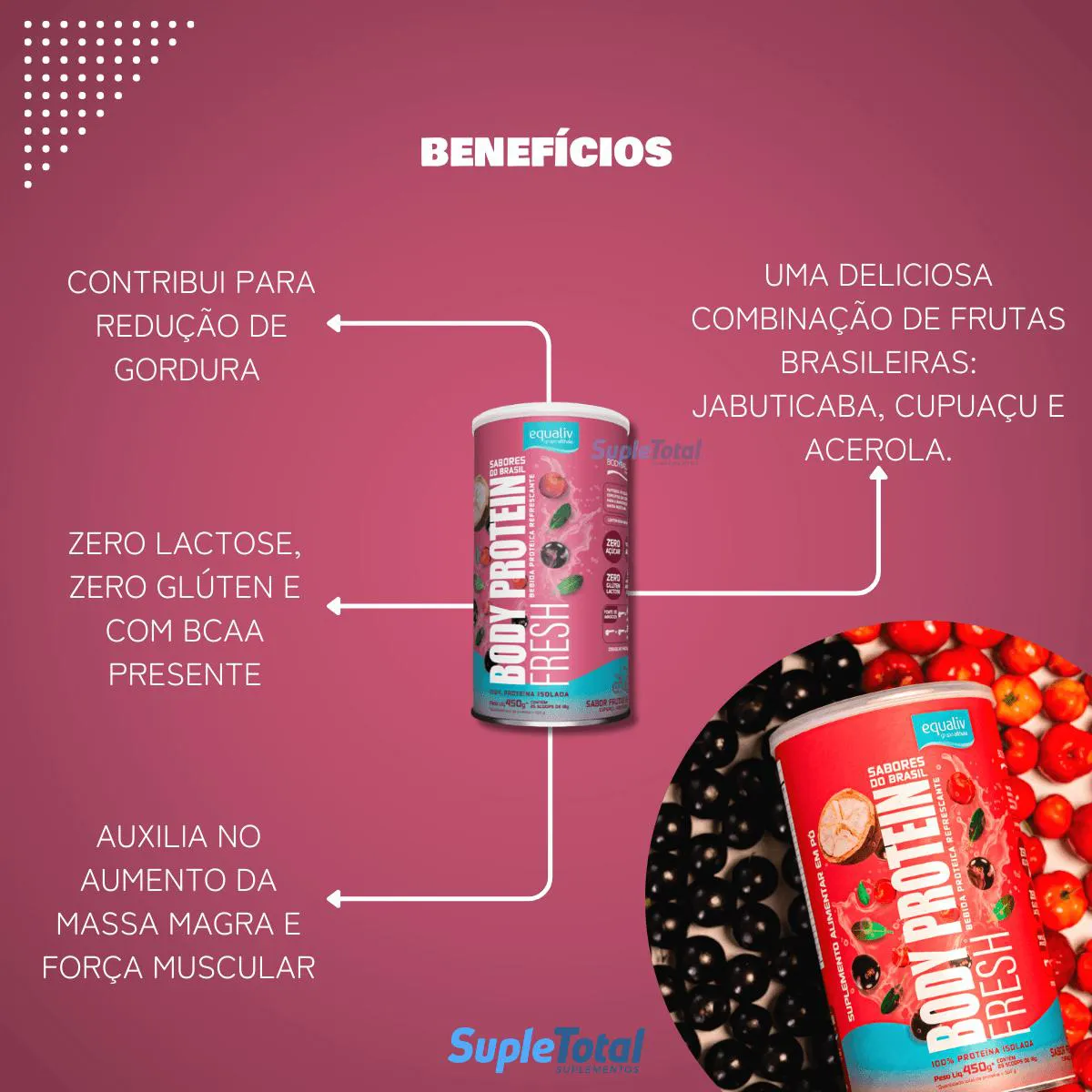 Body Protein Fresh Sabores do Brasil é uma extensão inovadora da linha de proteínas Body Protein da Equaliv. Desenvolvido com Ingredientes brasileiros, como cupuaçu, jabuticaba e acerola. É uma proteína isolada á base de peptídeo bioativo de colágeno hidrolisado e com tecnologia alemã, que contribui para o aumento da massa muscular, perda de gordura, aumento da força e recuperação pós-treino. Outro diferencial de Eualiv Body Protein é a presença de aminoácidos de cadeia ramificada (bcaa), a leucina, isoleucina e valina, os quais correspondem a cerca de 35% dos aminoácidos essenciais em proteínas musculares.