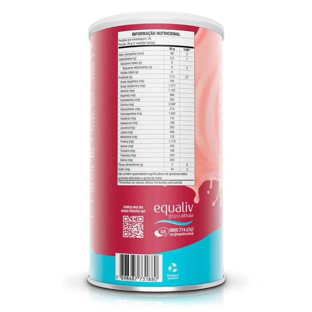 Body Protein (600g) A PROTEÍNA MAIS TECNOLÓGICA DO MERCADO! Equaliv Body Protein é uma proteína isolada e hidrolisada à base de peptídeos de colágeno, com a tecnologia inovadora alemã BODYBALANCE, trata-se de uma proteína isolada à base de peptídeos de colágeno que contribui para o aumento da massa muscular, emagrecimento, aumento da força e recuperação pós-treino. PROTEÍNA NÃO É TUDO IGUAL! Body Protein não é proveniente do soro do leite, sendo assim, pode ser consumido tranquilamente por todos aqueles intolerantes à lactose. Outro diferencial é a presença de aminoácidos de cadeia ramificada (bcaa), a leucina, isoleucina e valina, os quais correspondem a cerca de 35% dos aminoácidos essenciais em proteínas musculares. Benefícios: - Zero açúcar, Zero Glúten e Zero Lactose; - Tecnologia Alemã; - Sem adoçantes artificiais e Polióis.