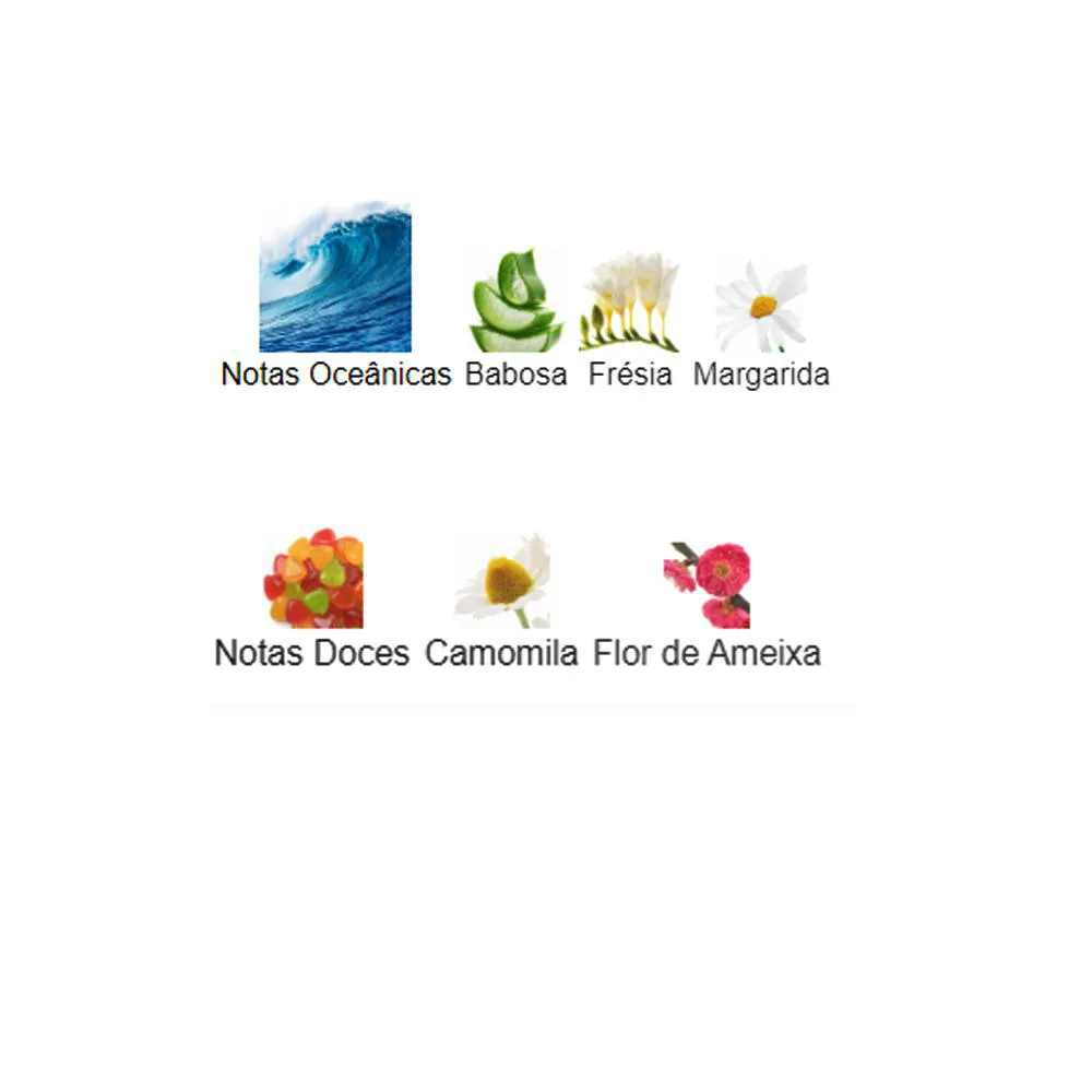 Notas Olfativas:Notas de Topo: Notas Oceânicas, Babosa.Notas de Coração: Frésia, Margarida, Doces.Notas de Base: Camomila, Flor de Ameixa