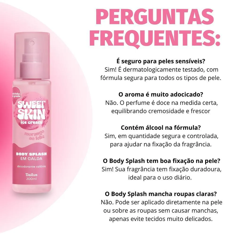 O Body Splash em Calda Dailus Sweet Skin Ice Cream Morango ao Leite 200ml é uma explosão de doçura e frescor que vai deixar sua pele perfumada e irresistível! Com fragrância inspirada em morango ao leite, traz aquele cheirinho cremoso e delicado que combina com momentos de autocuidado e relaxamento. Sua fórmula leve e hidratante envolve a pele com um toque suave, proporcionando sensação refrescante e deliciosa o dia todo.Benefícios Principais