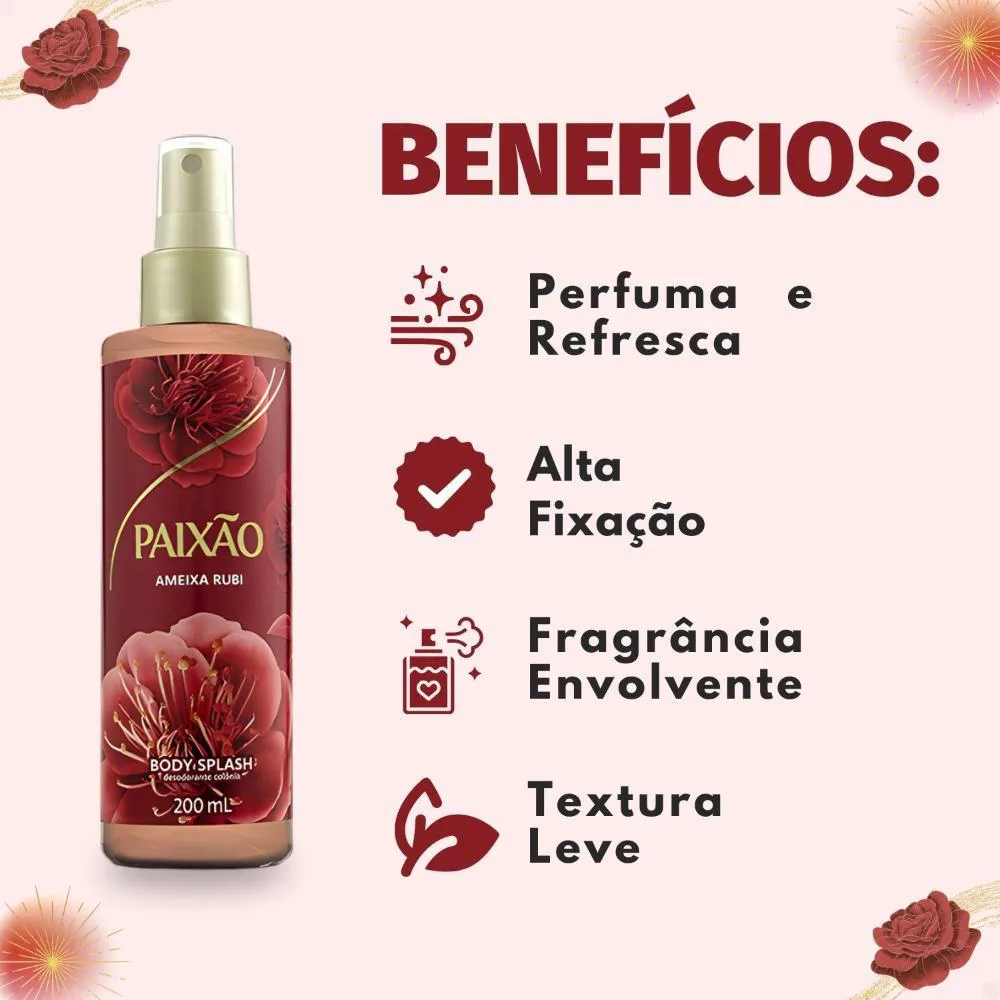 O Body Splash Paixão Ameixa Rubi é perfeito para ser usado em diversas ocasiões. Ideal para o dia a dia, após o banho, para prolongar a sensação de frescor e limpeza. Também é excelente para um toque de perfume leve antes de sair, seja para o trabalho, um encontro casual ou para momentos de lazer. Sua fragrância versátil se adapta a qualquer cenário, adicionando um toque de paixão e elegância.Modo de Uso/Aplicação: