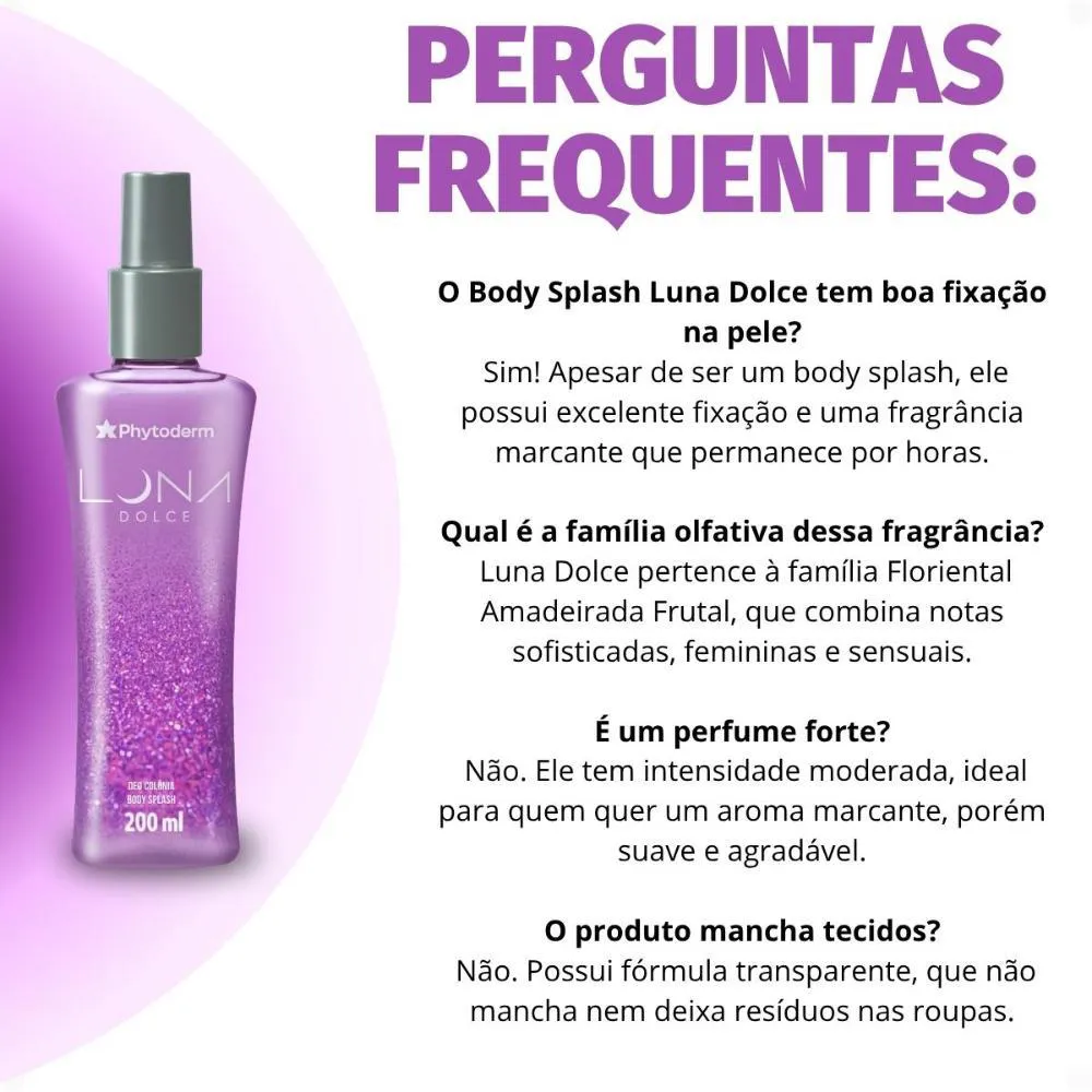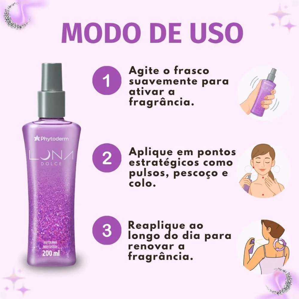 O Body Splash Phytoderm Luna Dolce é perfeito para diversas ocasiões, seja no dia a dia para manter a sensação de frescor e bem-estar, ou em momentos especiais onde você deseja realçar sua presença com uma fragrância marcante e elegante. Ideal para encontros, eventos sociais ou simplesmente para se sentir confiante e misteriosa.Modo de Uso/Aplicação