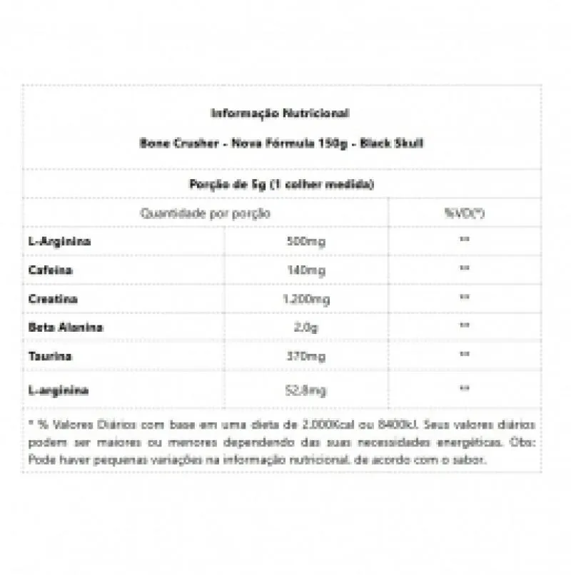 Bone Crusher (150g) O Bone Crusher é um pré-treino composto por beta alanina, creatina, arginina, taurina e cafeína, ideal para dar um gás nos seus treinos e potencializar seus resultados! Rico em compostos que sinalizam a ativação do óxido nítrico que tem sua função de melhorar a capacidade de concentração, diminuir a fadiga, ajudando na recuperação muscular. Durante sua utilização ele desenvolve um processo de hemodilatação, que tem como função específica o aumento do calibre das veias, facilitando assim o transporte do sangue para as células musculares, que aperfeiçoa o ganho de nutrientes como oxigênio, glicose e outros. Além disso, Bone Crusher (150g) é certificado pela NSF International, uma organização independente sem fins lucrativos que desenvolve padrões e certifica produtos relacionados à segurança alimentar. O selo NSF indica que o produto foi testado e avaliado quanto à sua qualidade, segurança e desempenho, e atende aos padrões e requisitos estabelecidos pela NSF. Esses padrões incluem testes de laboratório rigorosos para garantir que o produto não contenha contaminantes prejudiciais à saúde e que seja fabricado com materiais seguros e duráveis. Benefícios: * Maior força e explosão durante o treino;* Aumento da vasodilatação;* Suporte para treinos intensos;* Fórmula exclusiva; * Maior foco;* Diminui a fadiga central.