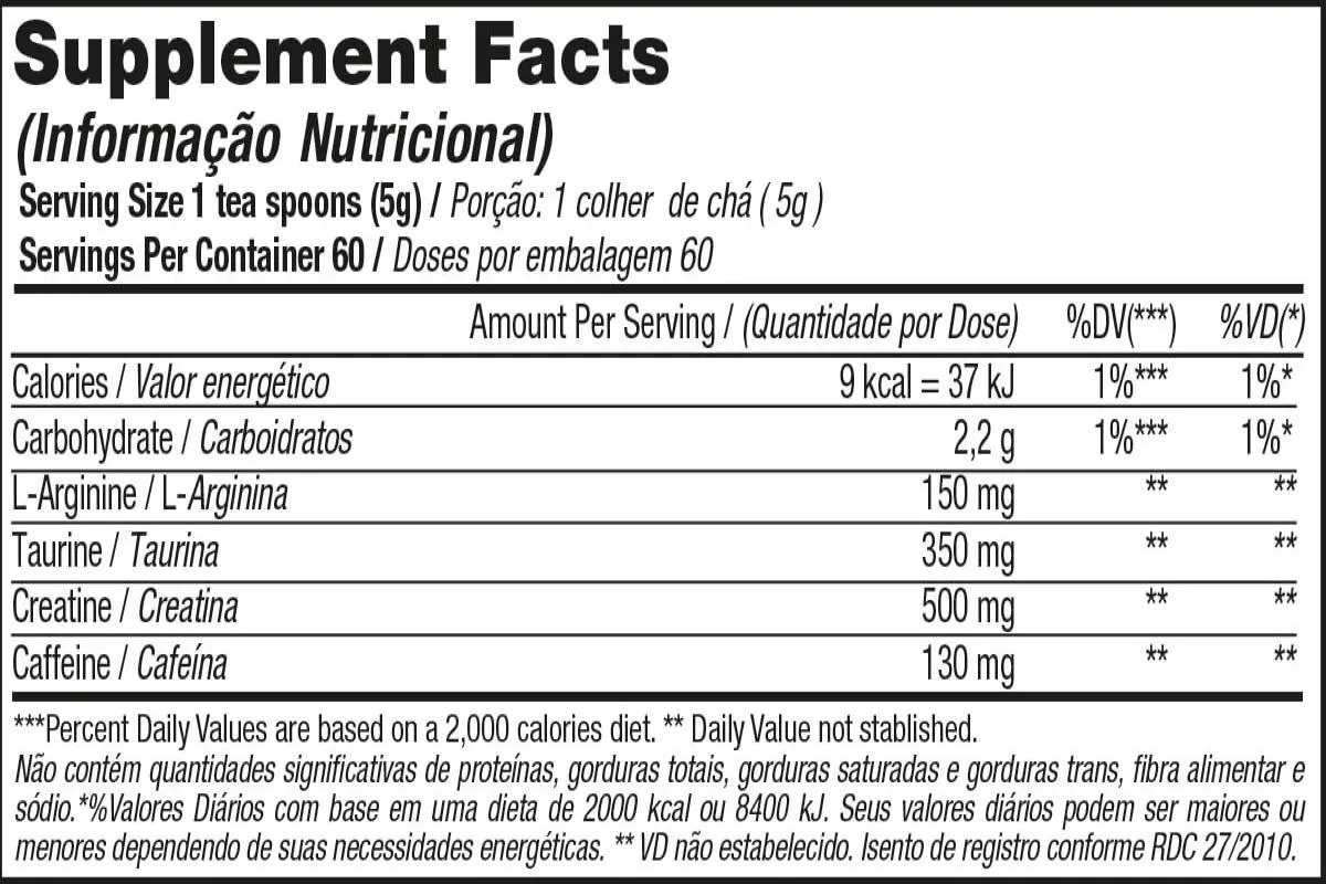 Maltodextrina, creatina monohidratada, taurina, arginina, cafeína, aromatizantes, antiumectante dióxido de silício, edulcorante sucralose, emulsificante goma xantana e corante artificial vermelho 40. NÃO CONTEM GLÚTEN. COMO CONSUMIR?