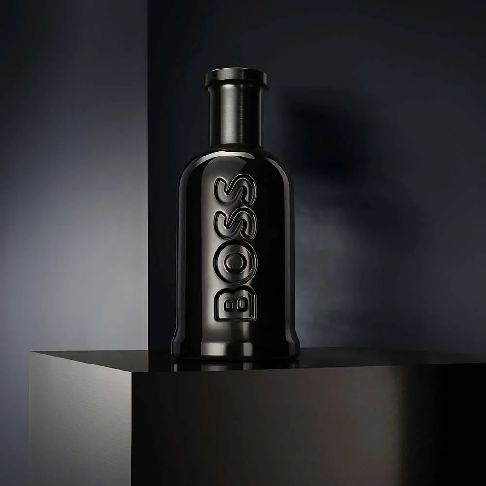 O frasco BOSS Bottled instantaneamente reconhecível é lacado em preto esfumaçado e coberto com uma tampa preta escovada para esta nova adição ousada à franquia. O frasco e sua embalagem externa preta fosca são finalizados com a marca de ouro gelado que reflete este poderoso perfume ousado para homens que vivem como um BOSS.