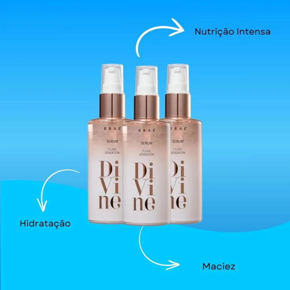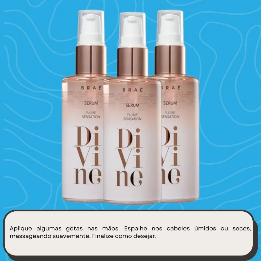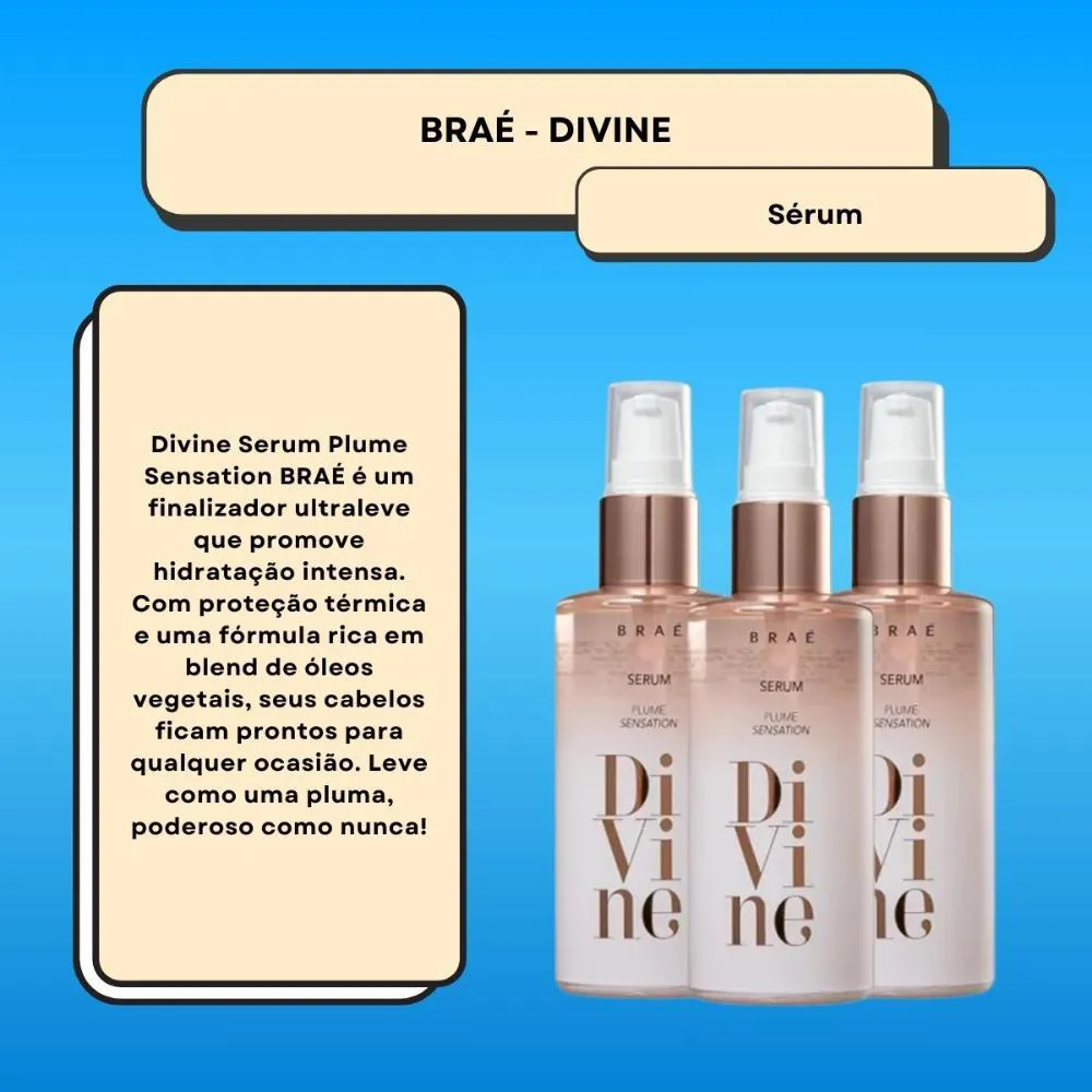 Braé Divine Plume Sensation - Sérum Reparador Capilar 60ml Sérum reparador para todos os tipos de cabelo. BRAÉ Divine Plume Sensation nutre e combate danos como o frizz e as pontas duplas. Sérum BRAÉ Divine Plume Sensation promove alinhamento das cutículas, impede aspecto pesado nos fios, confere elasticidade e garante toque sedoso. Seu cabelo fica leve e com balanço natural. Conselho de Aplicação Aplique algumas gotas do sérum na palma das mãos e espalhe no comprimento dos cabelos até completa absorção. Finalize como desejar. O principal diferencial do sérum é que ele tem uma textura muito mais leve do que o óleo tradicional e oferece um tratamento mais intensivo, já que sua fórmula é bem concentrada. Resultado Cabelo macio, com brilho e textura sedosa.