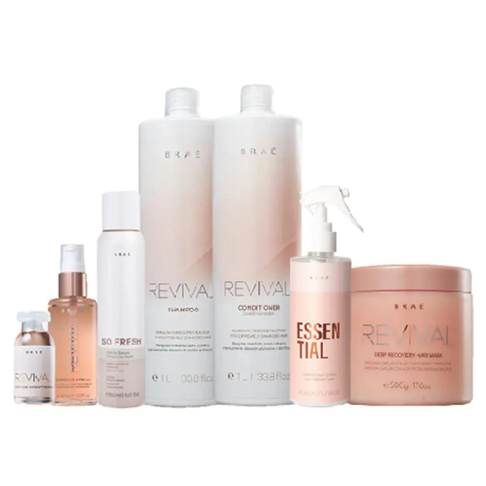 Kit de tratamento completo para cabelos danificados e fragilizados. O Kit BRAÉ Revival Full fortalece os fios da raiz às pontas, além de devolver a vitalidade e a leveza. O Kit BRAÉ Revival Full age internamente nos poros do cabelo para dar estrutura às áreas danificadas. Forma uma camada protetora em torno do fio para deixar o cabelo mais brilhante e resistente, com uma vida nova. Contém BRAÉ Revival - shampoo 1L: limpa e ajuda na recuperação dos fios desestruturados. BRAÉ Revival - condicionador 1L: desembaraça e recupera a fibra capilar para trazer força e beleza aos fios. BRAÉ Revival - máscara de Reconstrução 500g: recupera e protege a fibra capilar para que ela fique forte, brilhante e hidratada. BRAÉ Essential - Hair Repair Spray 260ml: Fluído finalizador reparador com proteção térmica, para todos os tipos de cabelos. BRAÉ Revival Gorgeous Shine - Óleo Capilar 60ml: nutre e fortalece as pontas, além de devolver a vitalidade aos fios. BRAÉ Revival Power Dose 13ml: Ampola de tratamento concentrado para cabelos danificados, recupera a fibra capilar desestruturada de maneira imediata. Oferece fios mais brilhantes, fortes e hidratados em poucos minutos. BRAÉ So Fresh Shampoo a Seco - Shampoo a seco vegano para todos os tipos de cabelos que sofrem com oleosidade, limpa instantaneamente o couro cabeludo e os fios, sem deixar resíduos esbranquiçados quando aplicado no couro cabeludo e nos fios.Conselho de Aplicação