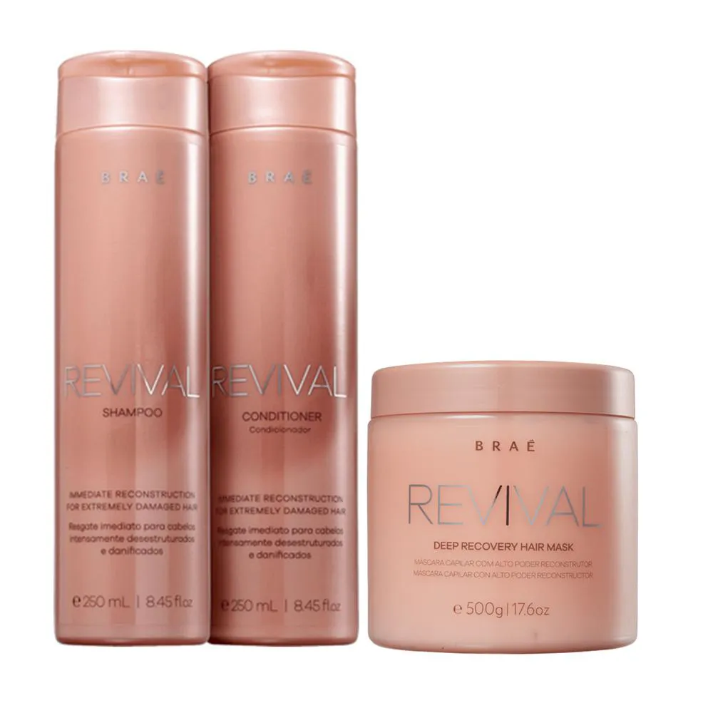 Kit de tratamento para cabelos danificados e fragilizados. O Kit BRAÉ Revival Trio hidrata, fortalece e protege os fios para que eles fiquem mais saudáveis. O Kit BRAÉ Revival Trio age internamente nos poros do cabelo para dar estrutura às áreas danificadas. Forma uma camada protetora em torno do fio para deixar o cabelo mais brilhante e resistente, com uma vida nova. Contém BRAÉ Revival - shampoo 250ml: limpa e ajuda na recuperação dos fios desestruturados. BRAÉ Revival - condicionador 250ml: desembaraça e recupera a fibra capilar para trazer força e beleza aos fios. BRAÉ Revival - máscara de Reconstrução 500g: recupera e protege a fibra capilar para que ela fique forte, brilhante e hidratada. Ação